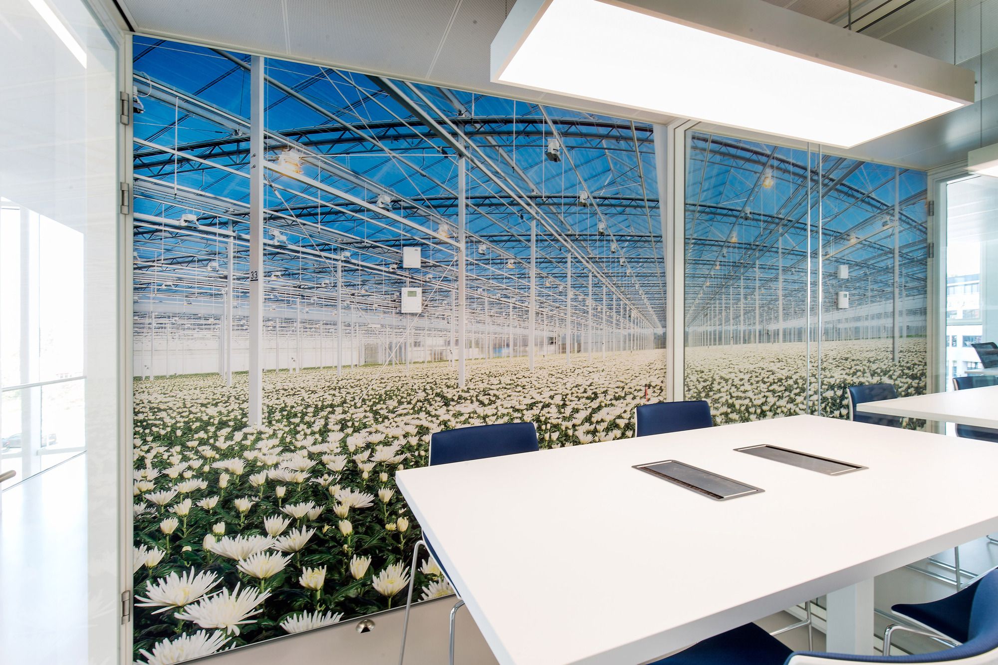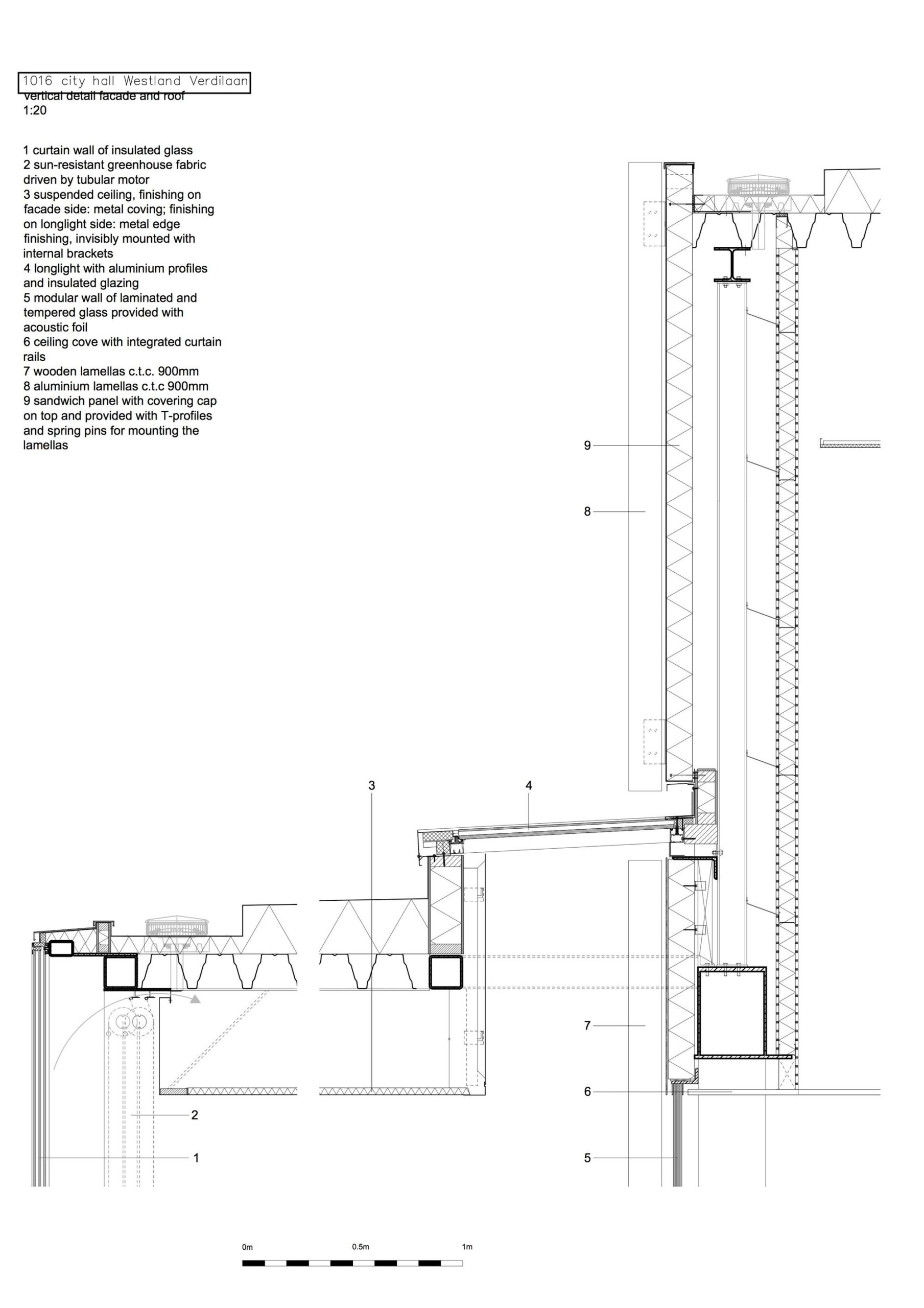 The buildings were conceived with a focus on a variety of theme’s, such as representatives, spatial quality, functionality, flexibility, comfort and sustainability. On both locations, the architecture is based on the metaphor of a green house. After all, the green house is an omnipresent element in the urban, cultural and economic aspects of the Westland municipality. Within the context of the green house metaphor, the façade is the covering of everything that lives and grows inside; a thin shell enabling internal processes to proceed swiftly and smoothly. The new town hall is a place with optimal transparency. This adds to the building’s experience as well as to the staff’s and visitor’s well-being, but it also underlines the democratic character of the town hall; there is a strong visual connection between the inside and outside, between the government and the civilians. Also characteristic of both the green house and the new town hall and government office is the repetition in the rhythmic of the façades. On both locations, this renders a pleasant and quiet streetscape. All color is on the inside.