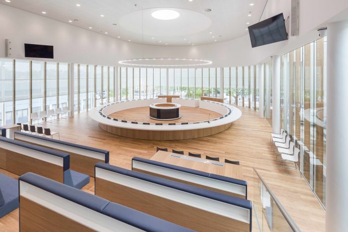 The transparent atrium façade offers passers-by a direct view on the administrative functions, while the wooden slats nevertheless make for a sense of demarcation as well as lend the administrative furniture-piece a special appearance and dignity. The high degree of insight and transparency is inviting and the light and warm appearance accommodates an agreeable working environment. The layout of the different services is logical, natural and clear. The boardroom is sizable and many rooms are multifunctional. Movable wall panels grant maximum flexibility and adaptability. During the day, the committee rooms can be used as meeting rooms. When the flexible walls are fully opened, a large open space for press conferences, parties, weddings, exhibitions and large gatherings comes into being.