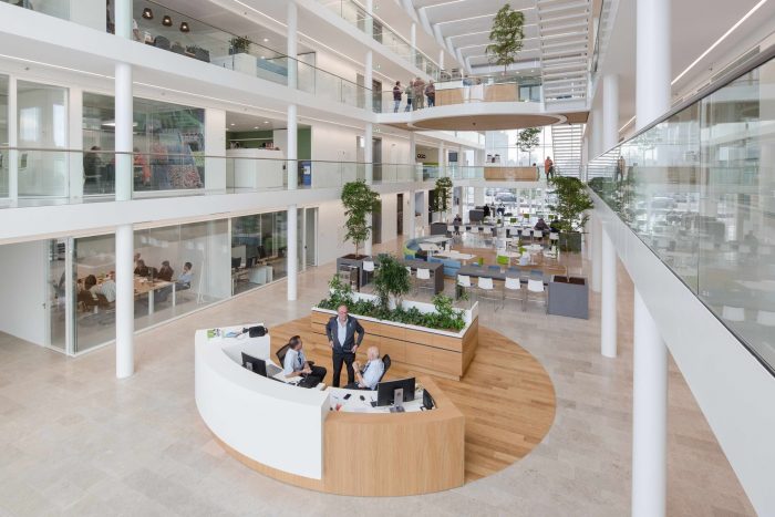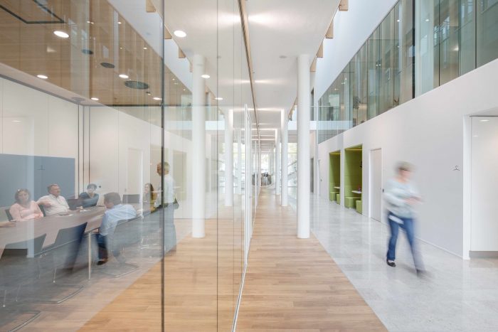 The large open space of the atrium holds several ‘islands’ that seem to float freely in space. They are connected to the office floors by means of walkways. The islands are fitted with seats and coffee pantries; it is here where employees discuss the weekend or, for example, eat cake on a birthday. Thus, the islands not only significantly contribute to spatial diversity, but also play a key role in stimulating meetings, interaction and social cohesion. Also, they are part of the traffic routes between the two office bays, which can be arranged freely.