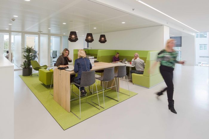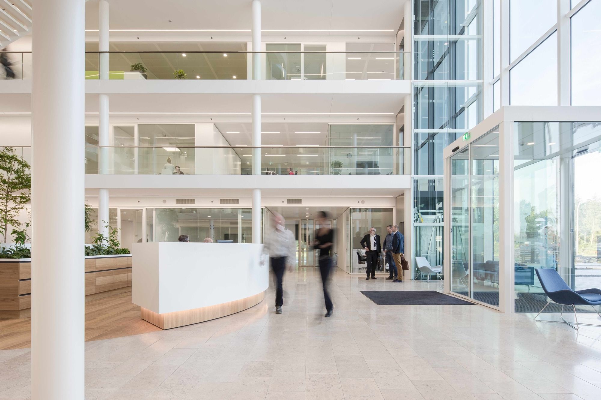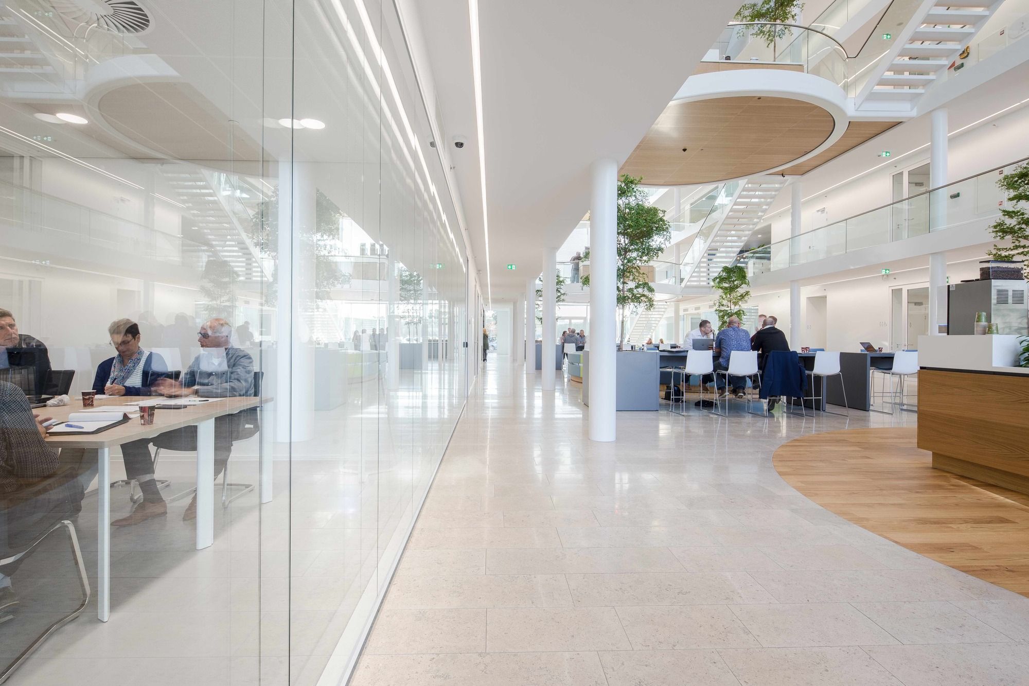 The municipal office offers a contemporary working environment with different types of workplaces and many options for meeting and sharing knowledge. The ground floor houses general functions like the project, meeting and instruction rooms, as well as the dispatch and technical areas. The upper floors are arranged with different types of workplaces in open, semi-open and more confined areas in a gradual scale ranging from bustle through murmur and peace & quiet. The quieter, more private areas are situated along the façades; the areas for meeting and cooperation are positioned along the lively atrium. The informal living rooms with both high and low tables and chairs connect directly to the meeting islands. At the building’s end, the upper floor holds a special brainstorm lounge connected to an outdoor balcony.