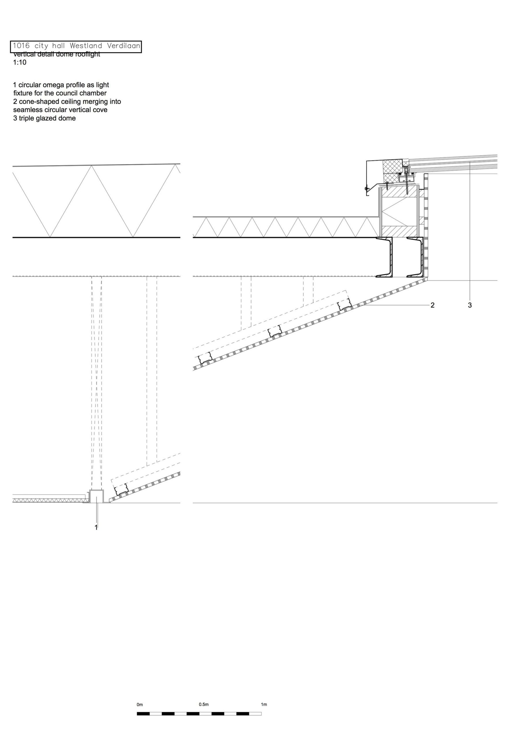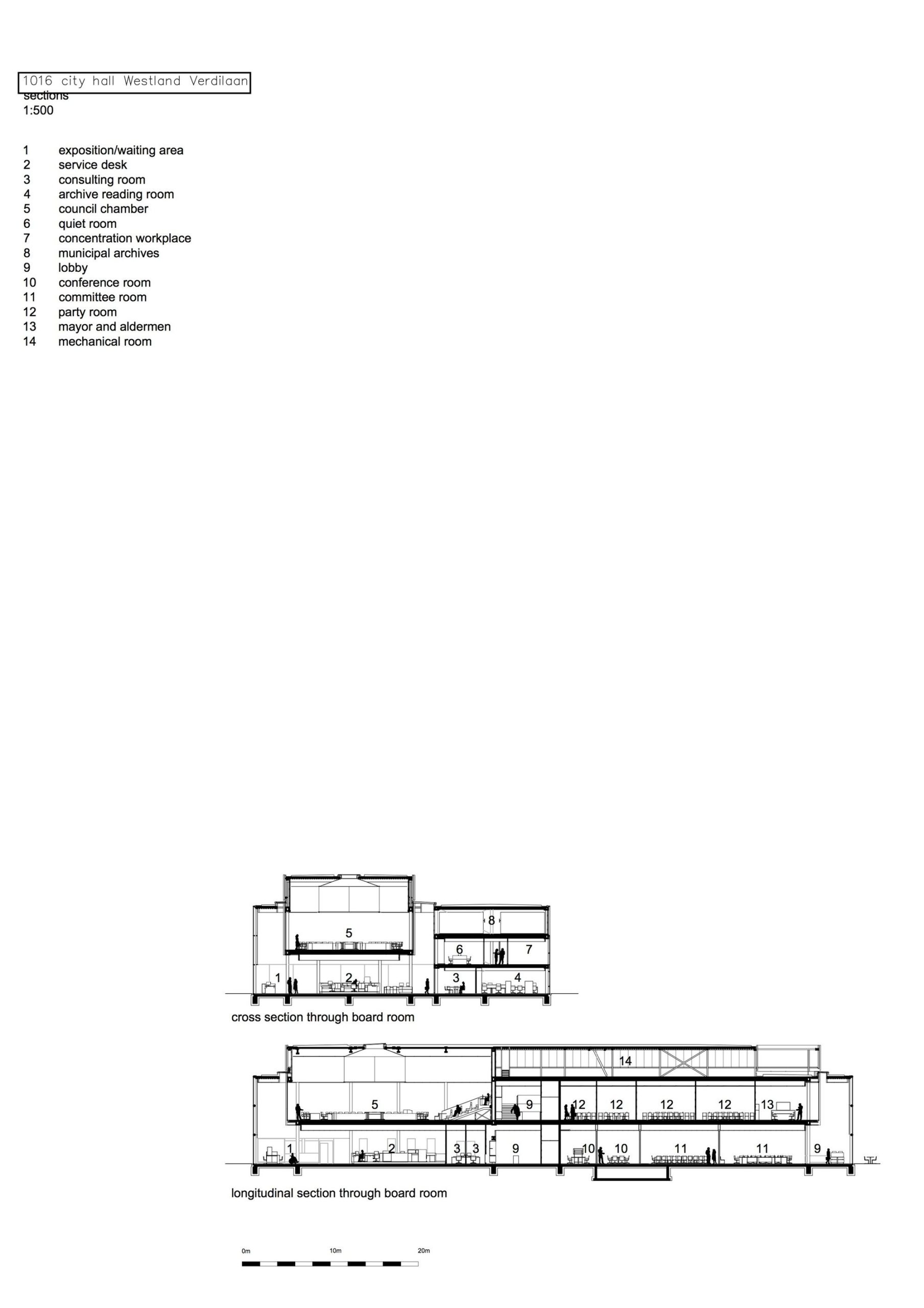 In front of this generic bay lies a large, transparent and inviting atrium. One side of its ground floor level holds the public entrance area; the representative reception area and restaurant are situated on the opposite side. In the middle of the atrium, the council functions are housed in a spacious ‘furniture-like’ construction. This has had rounded ends, extra high ceilings and a skin of glass and wooden slats. The lower level contains the shared functions of the the administrative apparatus like the committee rooms and the conference center. The upper level comprises among others the council hall, the room for the Mayor and Aldermen and the party chambers.