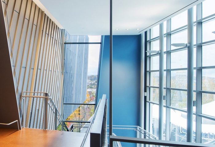 At the western end of the building, an angled pre-cast plane frames a commissioned sculpture by Tim Prentice, forming a focal point as one approaches the building from downtown along Main Street. A subtle angled opening cut into the solid brick plane along the Main Street façade filters light into the building and provides an initial foreshadowing of the geometry of the cantilever and the new gallery sequence within. A simple palette of materials and textures—precast concrete, zinc, brick, and glass—unifies the expansion with the existing building. At its northern end, and set into the topography of the site, the new brick wing mirrors the west wing to secure the symmetry of the original building while sponsoring a dramatic new zinc-clad cantilever to the south. The pattern of the zinc paneling, which wraps the cantilever, reflects the internal geometry of the truss structure. Floor-to-ceiling glass offers panoramic views at the angled terminus of the cantilever, which houses both a new temporary and permanent exhibition galleries. The reinforcement of views to the region and beyond will be heightened as visitors move throughout the building to strategic points within the public spaces and gallery sequence, serving to further contextualize the Museum’s permanent collection.