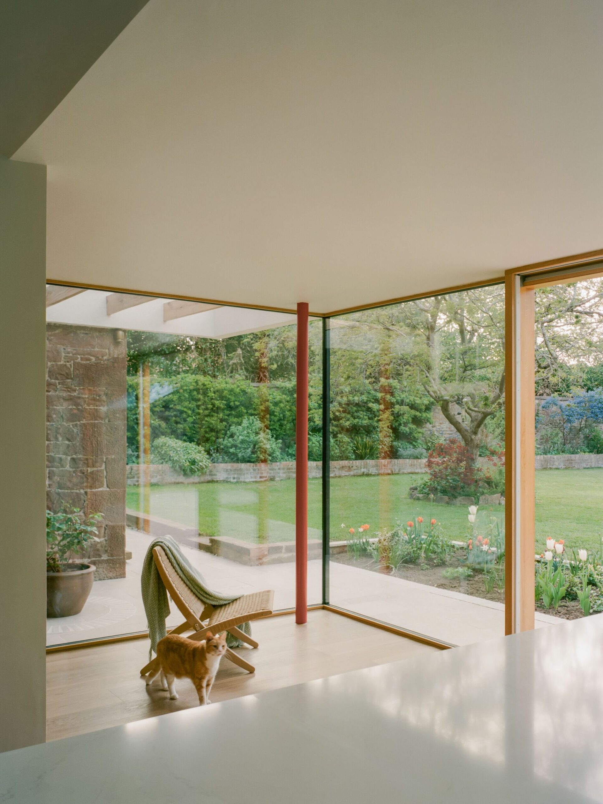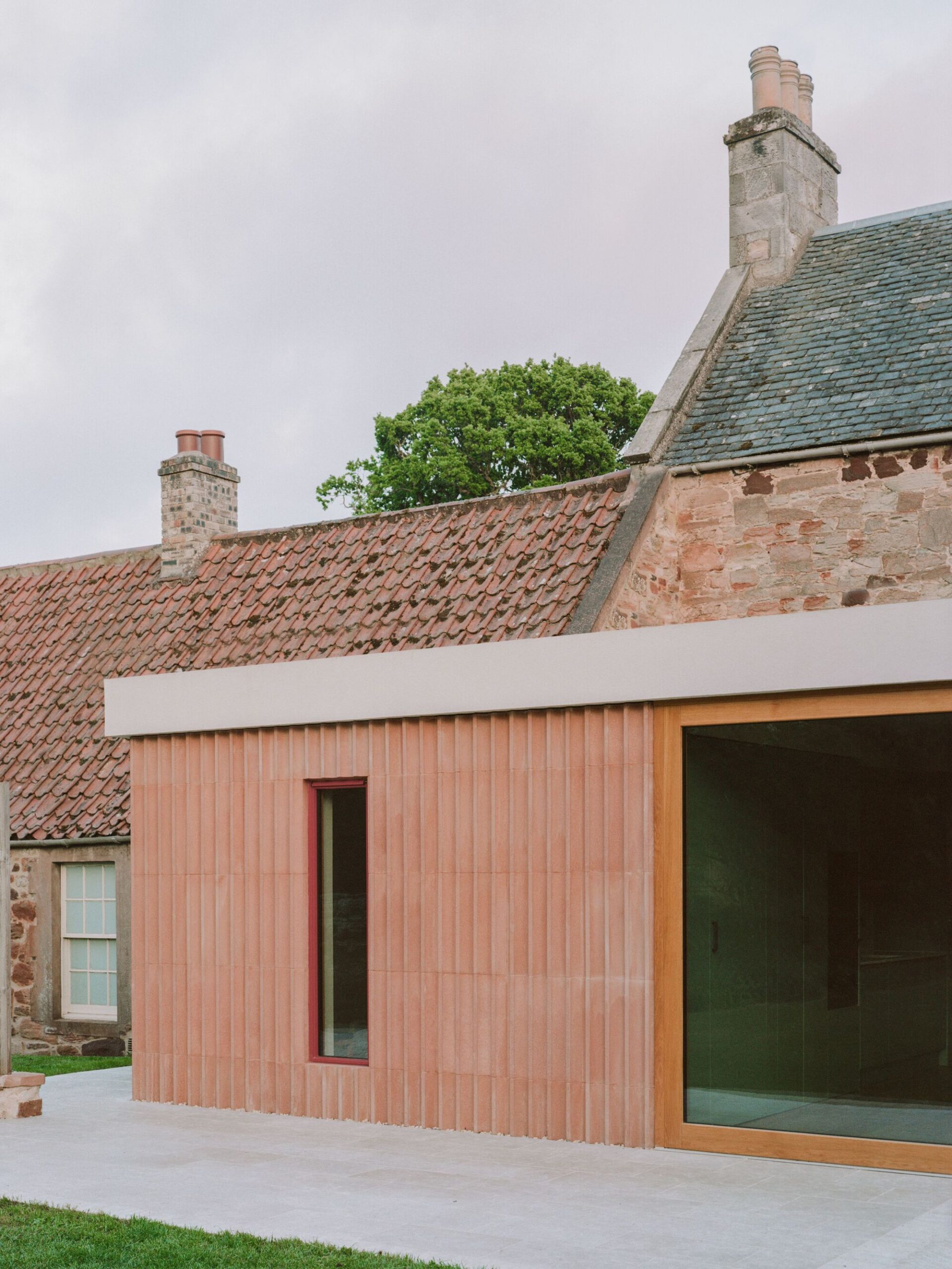 The extension visually stabilizes the rear facade, with a horizontal, light-colored concrete fascia tying the disjointed historic extensions together. Below, a blush-toned precast stone wall, designed by the architects, continues the narrative of masonry additions. In turn, reflecting the materials and techniques of its time. The reddish-pink coloring of the stonework playfully references the existing East Lothian sandstone and brickwork, while its fluted form echoes the undulating pattern of the adjacent pantiled roof.