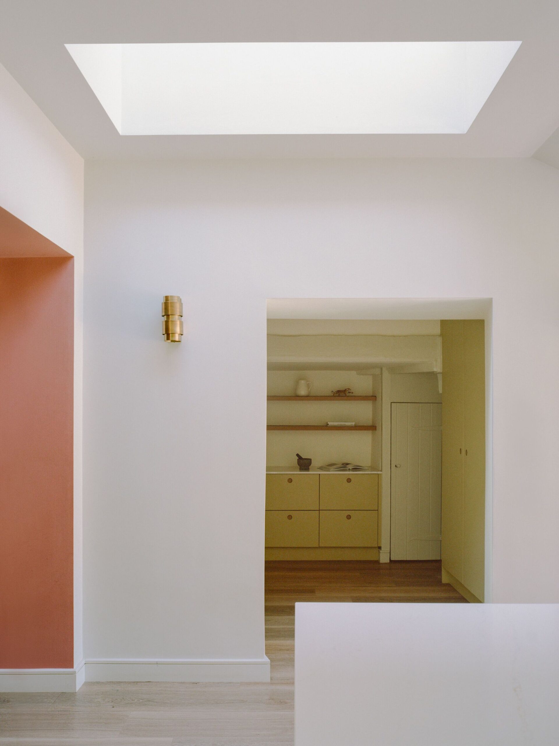 Now relocated to the new rear extension, the kitchen forms the central heart of the home, open, social, and framed by dual-aspect views of the garden and small courtyard. Underfloor heating further adds to the comfort of the space, integrated throughout the ground floor and powered by an air source heat pump, a new and efficient system for heating the house’s water. Given the north-facing orientation of the rear elevation, Pend were conscious to maximize natural light. A large vaulted skylight brings daylight deep into the kitchen, while a wide internal opening allows it to filter through to the adjoining dining room, creating a continuous sense of brightness and spatial flow. A concealed door, designed to blend into the kitchen joinery, leads into the service rooms, including a laundry and boot room, which form a practical threshold between the main house and the annex, now used as an Airbnb rental.