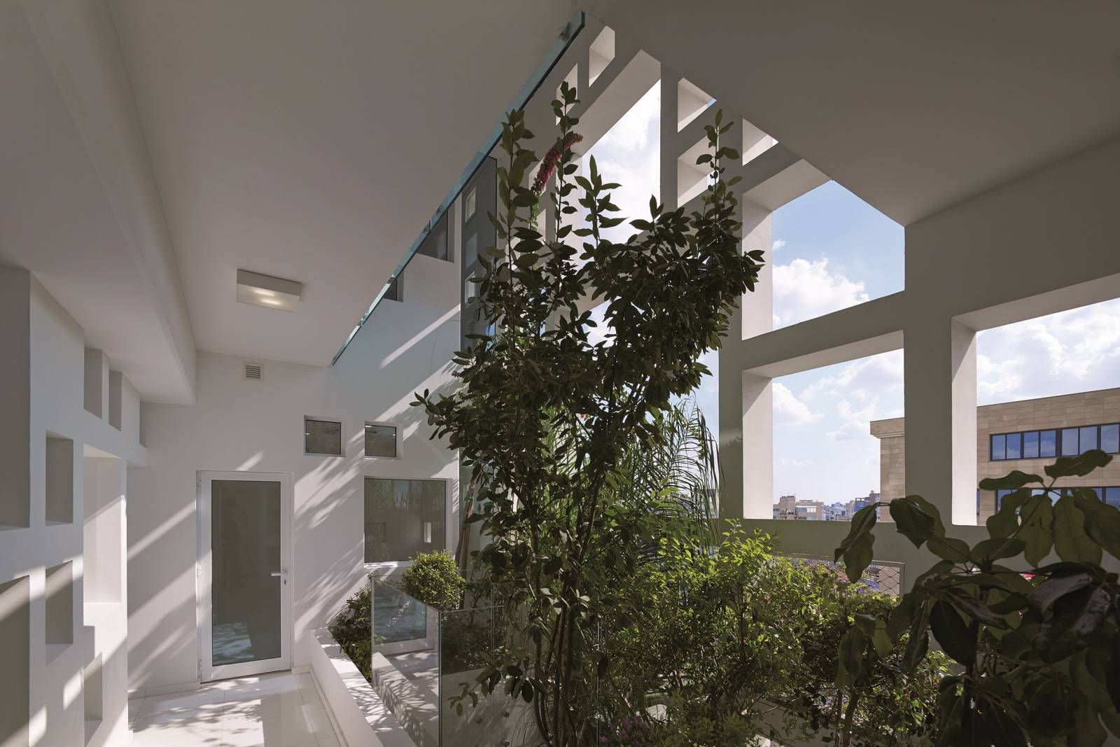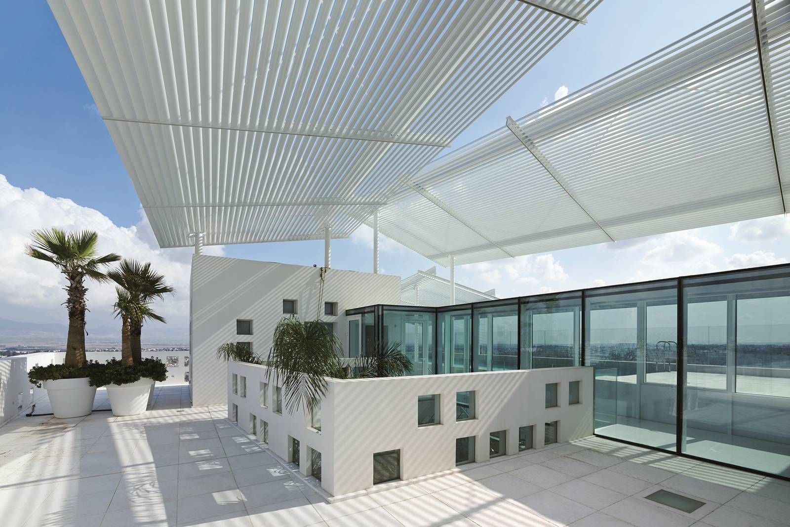 On the top two floors of the tower, a duplex apartment is organized around a central courtyard inspired by the Cypriot traditional architecture. Three large shades protect the apartment from the summer sun and emphasize the view to the sky.