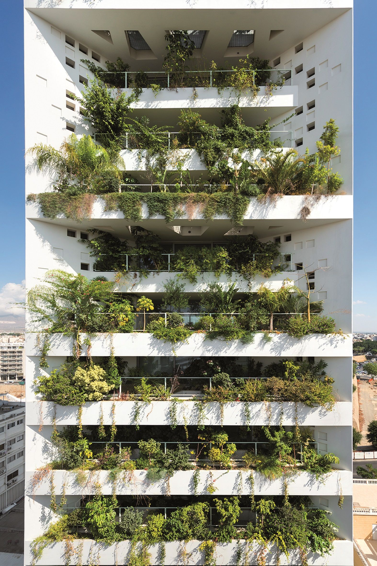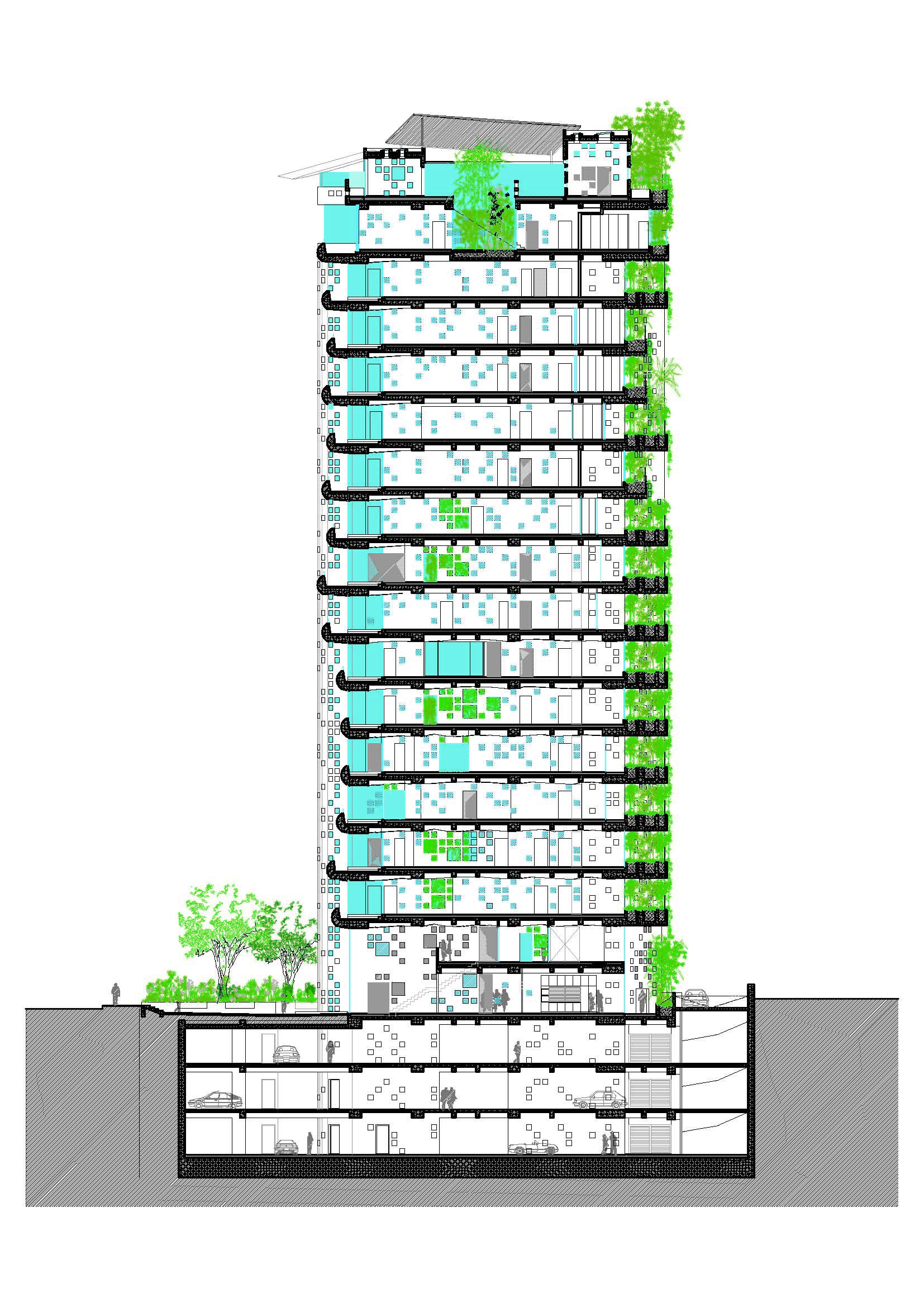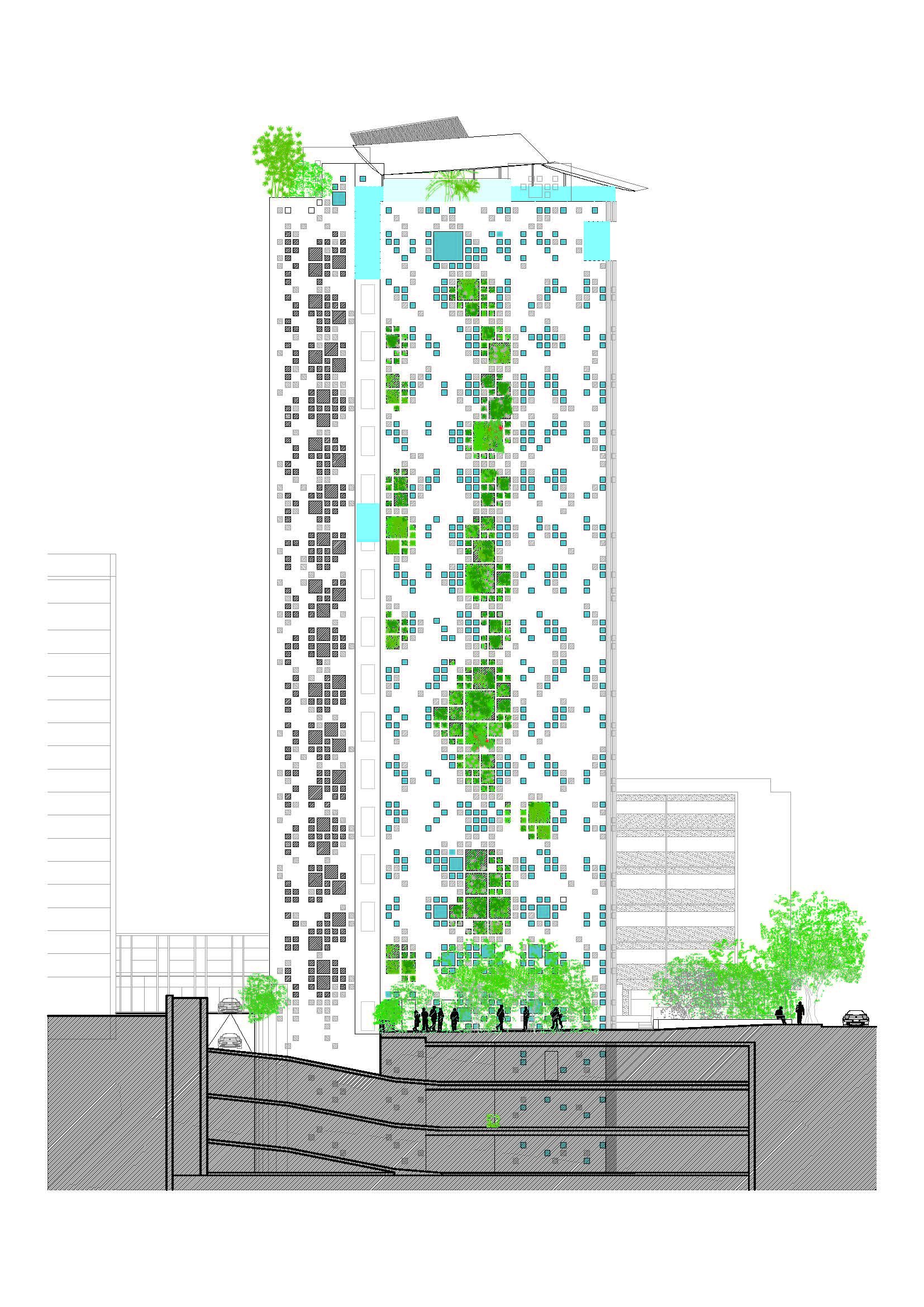 On the south façade, a vertical landscape covers approximately 80% of the building’s façade area. This exceptional living environment is working like a natural “brise soleil”. The plants will act as a natural sun control shielding the apartments and the offices from direct sun during summer while admitting a maximum of sunlight in winter. This “living “façade” supports a variety of Cypriote climbing and spreading plants and will be continually transformed by the cyclic movements of the different seasons. 400 years old olive trees continue this vertical landscape on the perimeter of the building. It creates the link to the adjacent urban park and gets a part of the scenery of the city. The apartments and office feature indoor/outdoor loggias that extend the living space outside to take maximum advantage of Nicosia’s temperate climate.