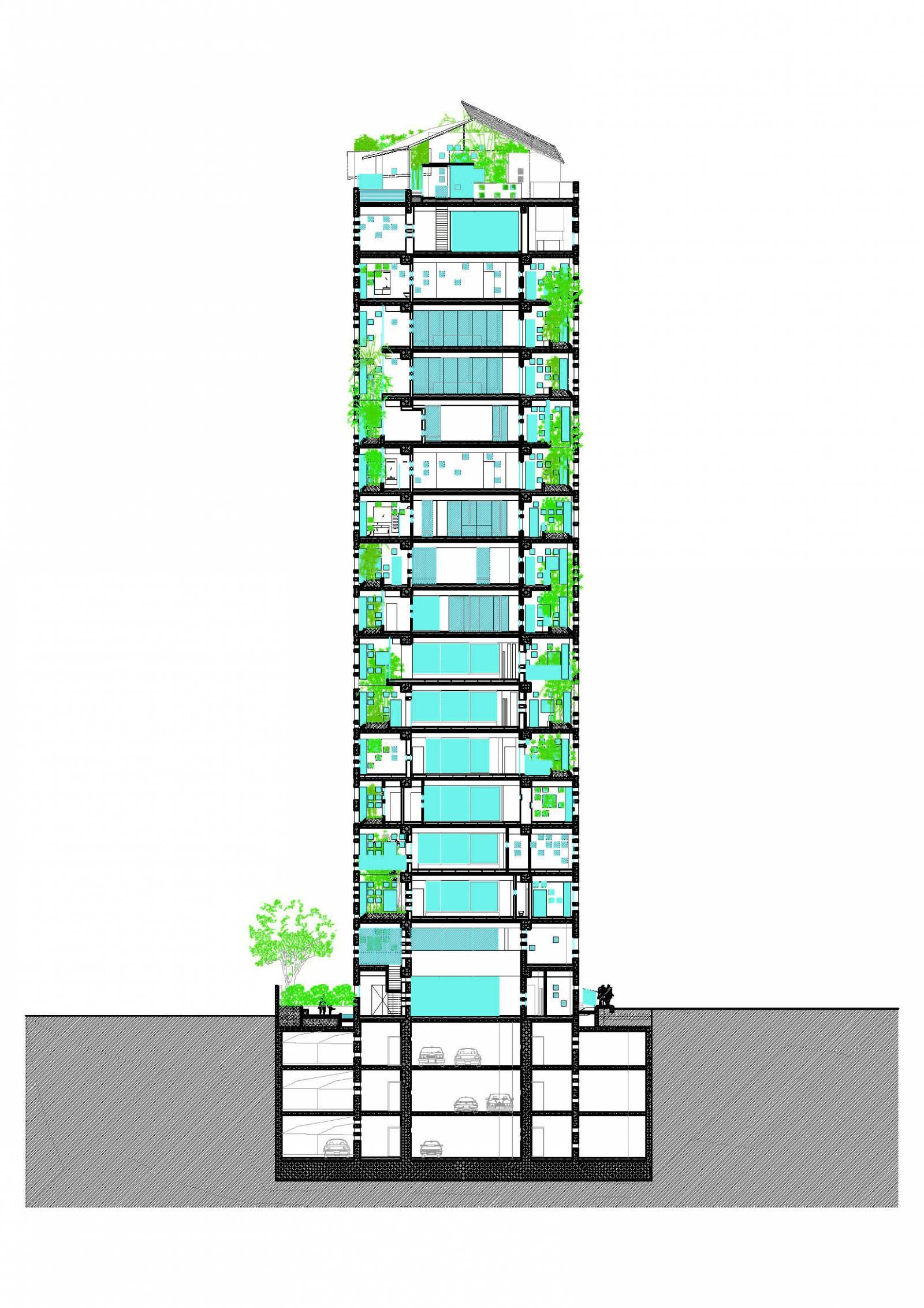 On the north façade, the loggias extend out to take maximum advantage of views of the park and the city skyline. A series of cascading terraces and large balconies acknowledge the Mediterranean climate and the significance of spending time outside.