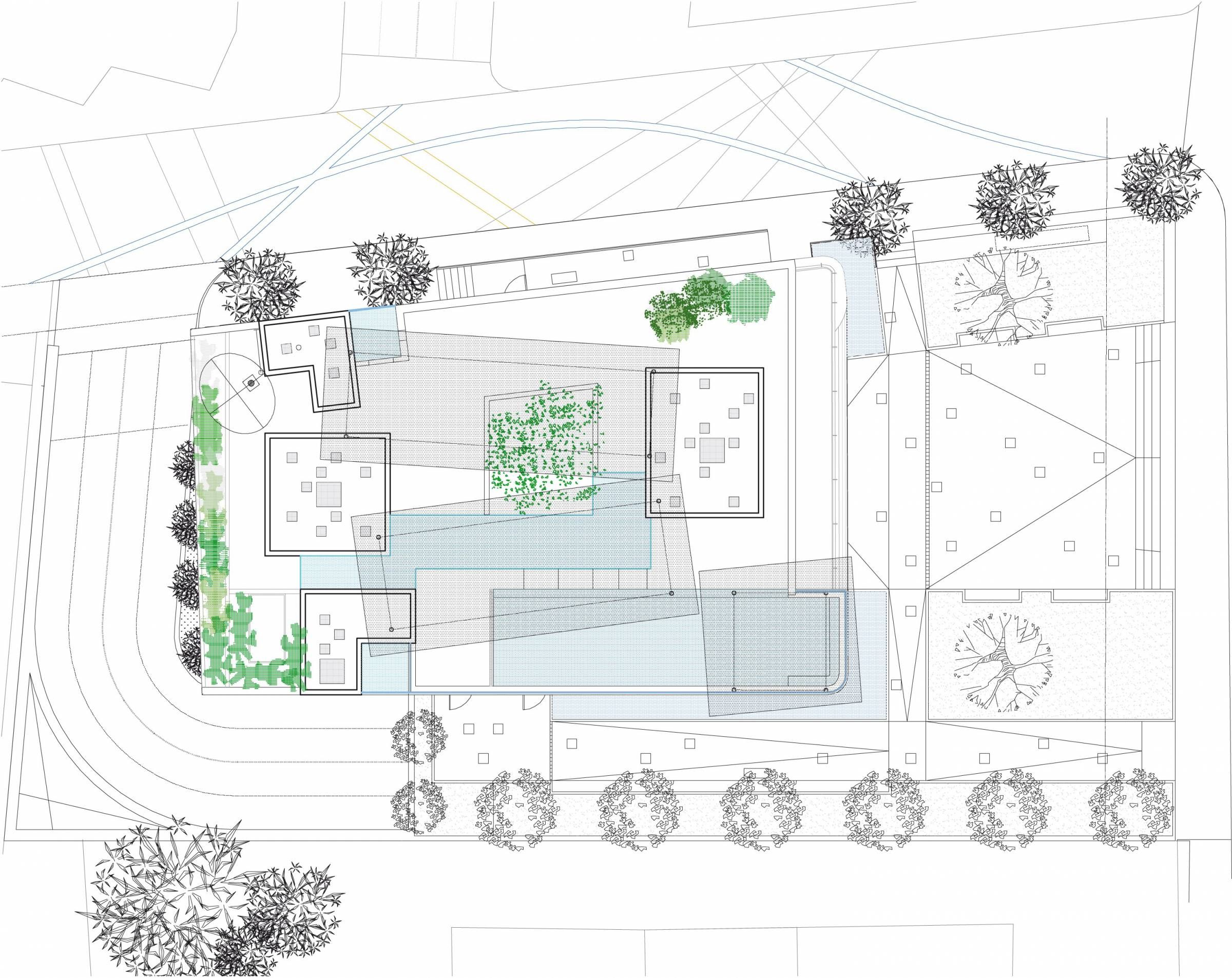 Interesting shadow games determine the exterior and interior space in relation to the different sun position of the day. An accumulation of voids and windows shaped by a size of 0,40m x 0,40m creates a unique screen image from the outside and inside point of view. At night the wall as a giant screen is pronouncing the inhabitants light needs and strengthen even more the random system of the facade.