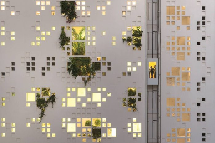 On the east and west façade, the loggias extend in from the pixelated concrete walls façade to protect residents and office occupiers from noise, wind, and sun. Punctured by a random array of openings, sometimes glazed sometimes left open, especially in the garden areas, the massiveness of the walls is negated by the numerous perforations.