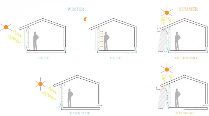 The concrete wall stores heat, which is used to warm the air as it arrives at the bottom, causing the heated air to ascend and allowing it to flow back into the structure via a vent at the wall’s peak. The wall also gently warms the interior space by radiating heat from the outside.