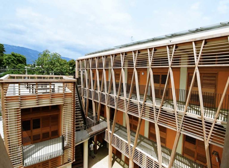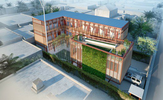 The design of William Jefferson Clinton Children’s Center integrates biomimicry to create a locally harmonic and a responsive building solution. The building references a culturally significant keystone species, ‘the kapok tree’, both in the branching diagrid supports of the balcony system, the low emissivity and the heat-shedding characteristics of its second skin. Protecting the building like tree bark, a bamboo ‘boundary layer’ shields the exterior walkways and the vertical surfaces from direct sunlight while allowing for daylighting and natural ventilation. There is a  roof garden which acts as the building’s ‘foliage’ supporting the solar energy system and providing additional green space.