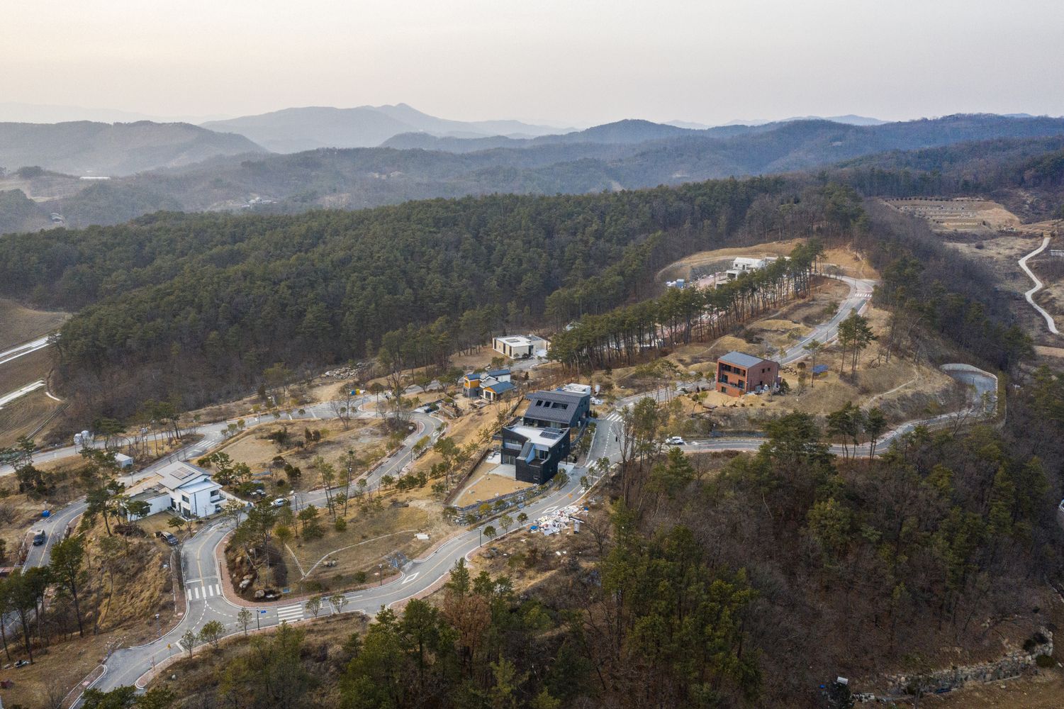 The undulating roofscape of the house provides a topographic foreground to the geological background of the Gyeryong Mountains beyond