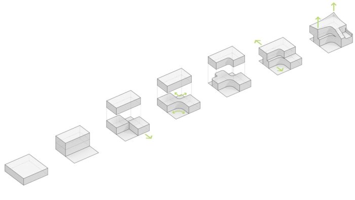 In order for the desired room layouts to work, it was necessary to introduce curved corridors to connect the spaces with sufficient clearance.