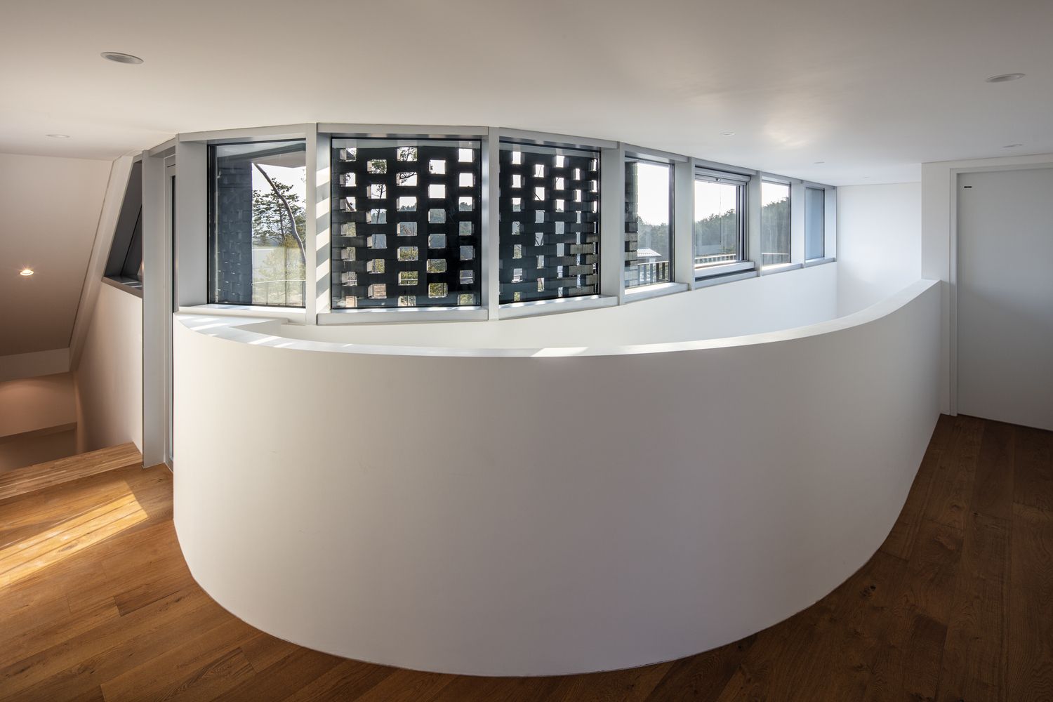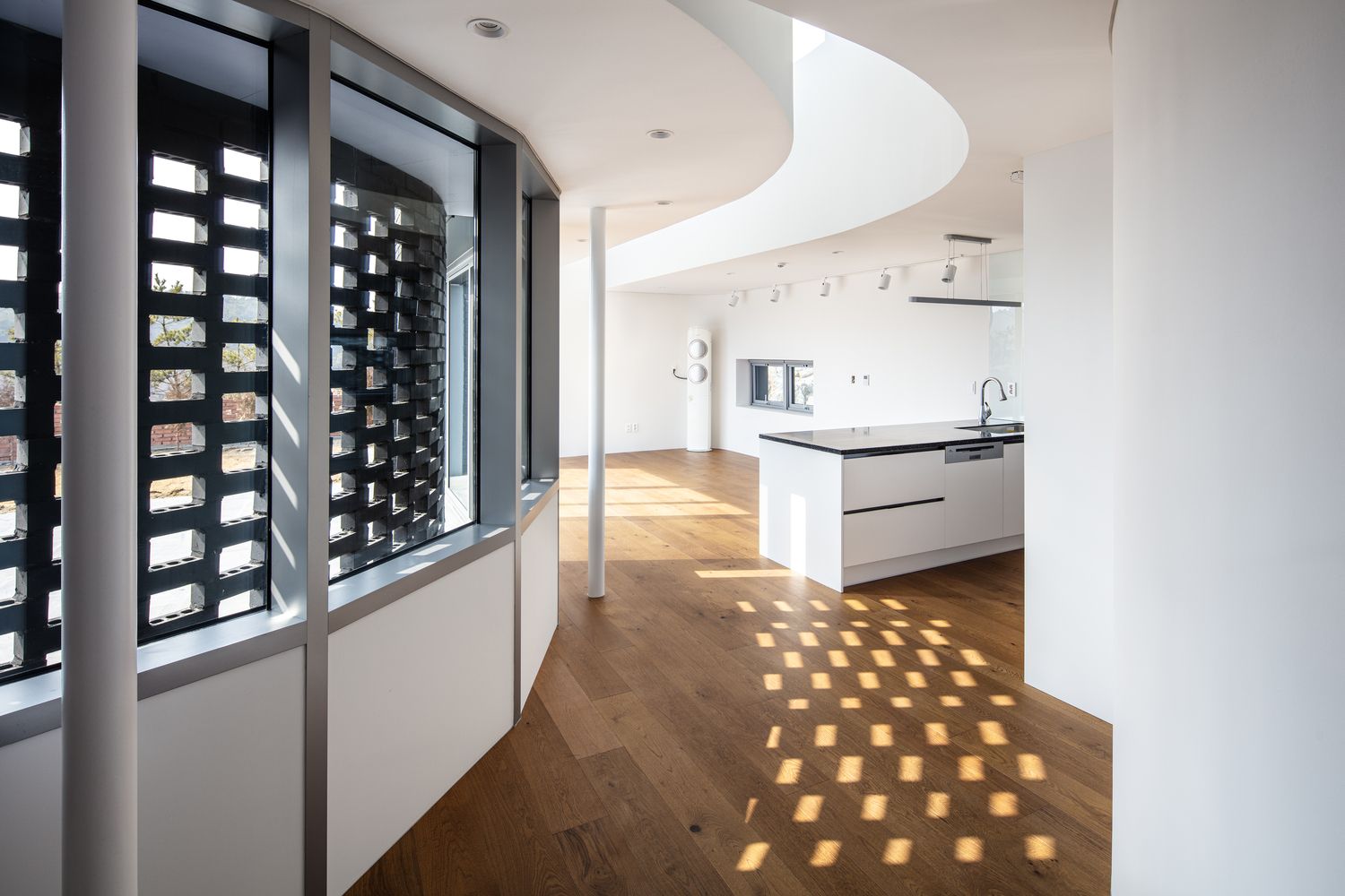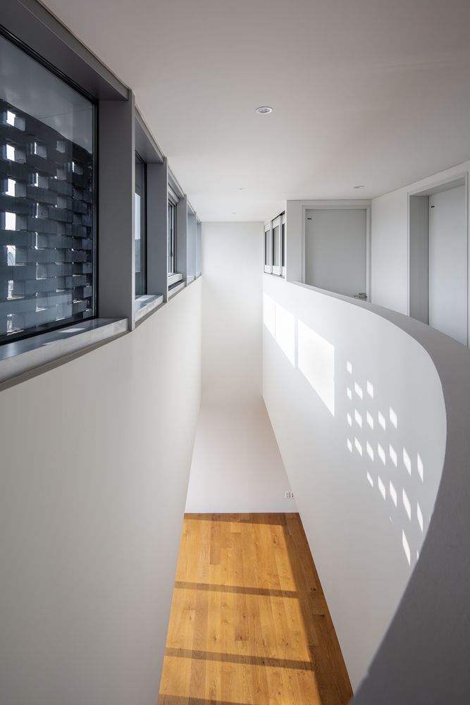 Third, the shifting of the curved corridors made it possible to create an extended opening between the floors for natural vertical air circulation during the summer as well as creating a connection between the floors for ease of communication.