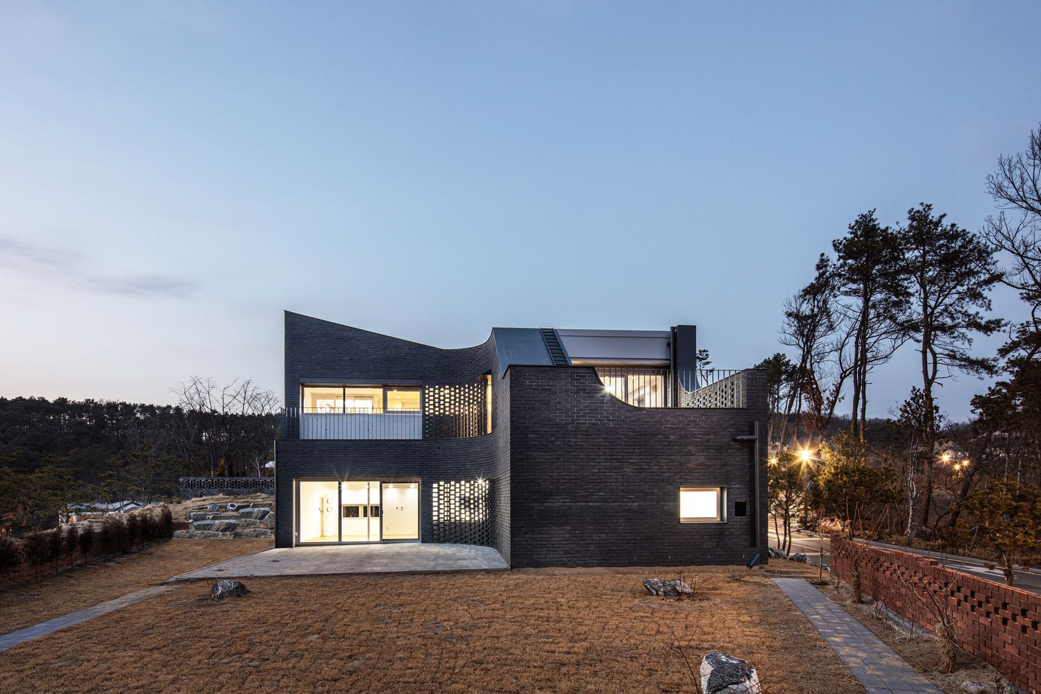 The opaque brick skin, with minimal punctured windows, wraps around the house from the street side on the east and the north elevation which faces the adjacent house, while gradually opening up fully into the garden and the horizon-facing balconies at the southwest corner.