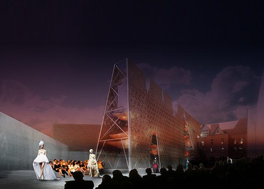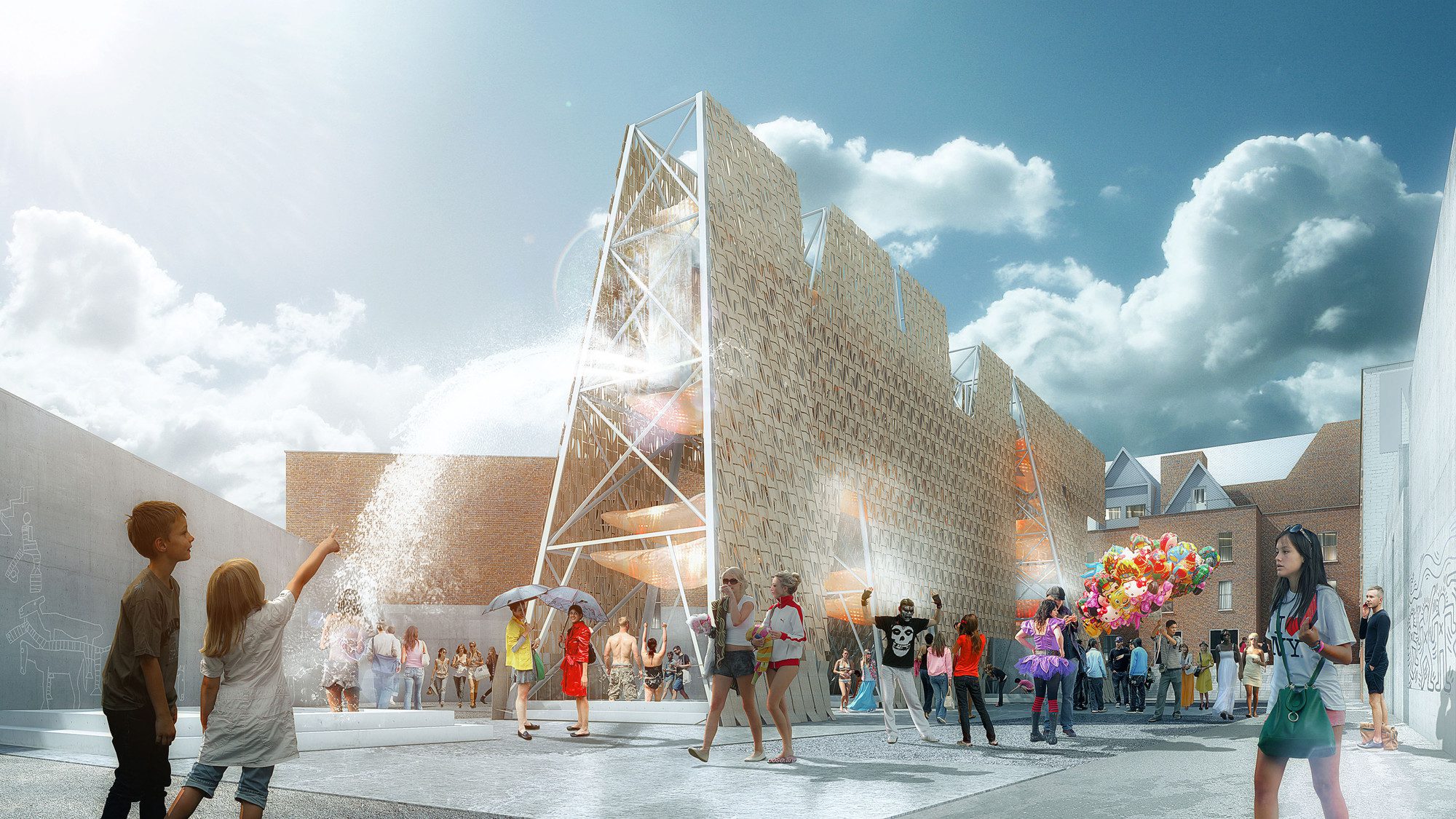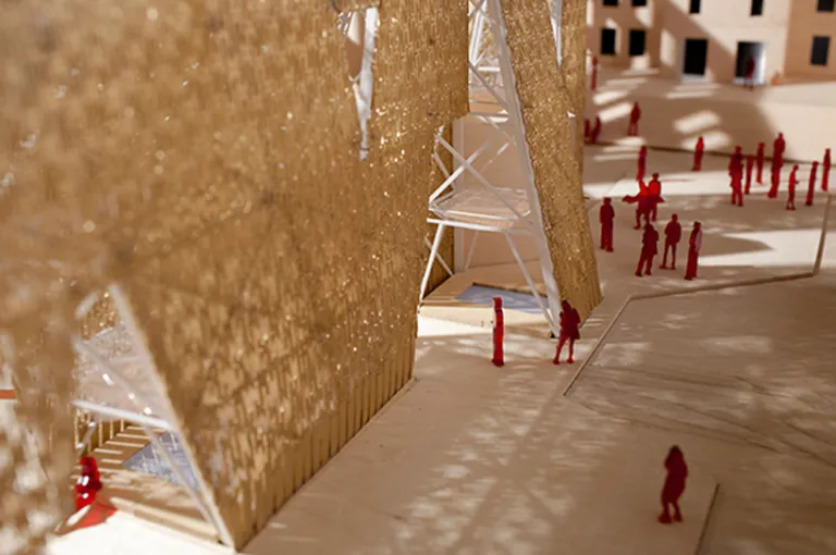 A shallow stage of reclaimed wood weaves around Party Wall’s base to create a series of micro-stages for performances of varying types and scales. At various locations under the structure, pools of water serve as refreshing cooling stations that can also be covered to provide additional staging space or a shaded area from the direct sunlight.