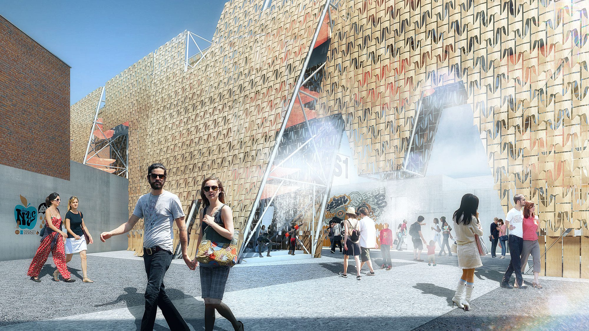 The porous façade is affixed to a tall self-supporting steel frame that is balanced in place with large fabric containers filled with water, and clad with a screen of interlocking wooden elements donated by Comet, an Ithaca-based manufacturer of eco-friendly skateboards.