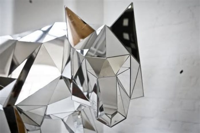The beauty and grace and rawness of the human form have always been a basis for art in the past, it’s been portrayed in every aspect imaginable, and still we find new ways to represent it. What you don’t see every day is the exploration of the form of wild animals. After all you can’t expect a wild wolf to stay still while you draw it and not run away. With Arran Gregory’s latest exhibit titled ‘Wolf’ he explores the animal form through a faceted surface adorned with mirrors covering every side of the acrylic resin and mineral stone sculpture underneath.