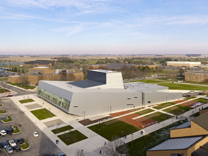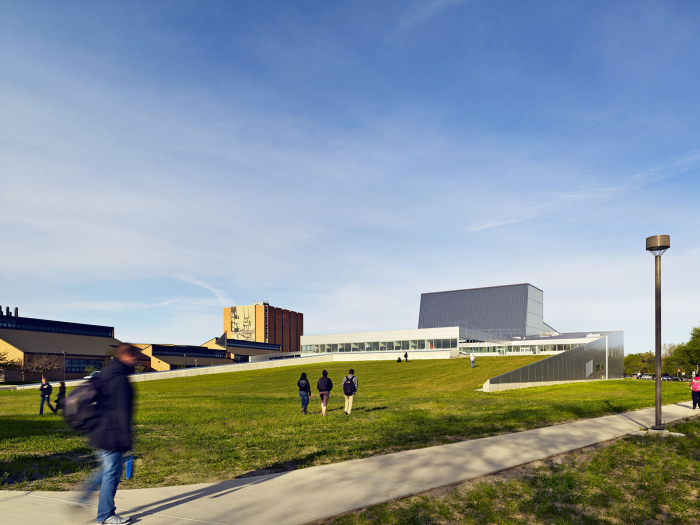 Does Snøhetta wanted to show us a ship which is coming into the surface from the depth. “The design of the building is a response to the smooth planes of the northwest Ohio landscape, with its far horizons and big sky“, explained Craig Dykers. The new Arts Center at Bowling Green State University in Bowling Green, Ohio features classrooms likewise production and studio spaces to link students and faculty in the School of Art, the Department of Theatre and Film and the College of Musical Arts.