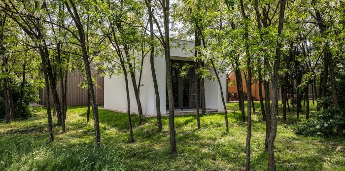 With the project’s client sharing his time between the hectic life of Budapest and the countryside, it was important that the house not only facilitated the needs of any typical urbanite but also created a tranquil space that could be the perfect place for him and his family to escape from the stresses of city living. The outdoor area encapsulates that, with its own pool and a number of terraces of varying heights to make use of. There is a modern addition in the form of the library, a white cube protruding out from the otherwise entirely wooden structure. The secluded spot embeds itself within the forest, intentionally representing urban architectural design but also creating a quiet space to read and relax.
