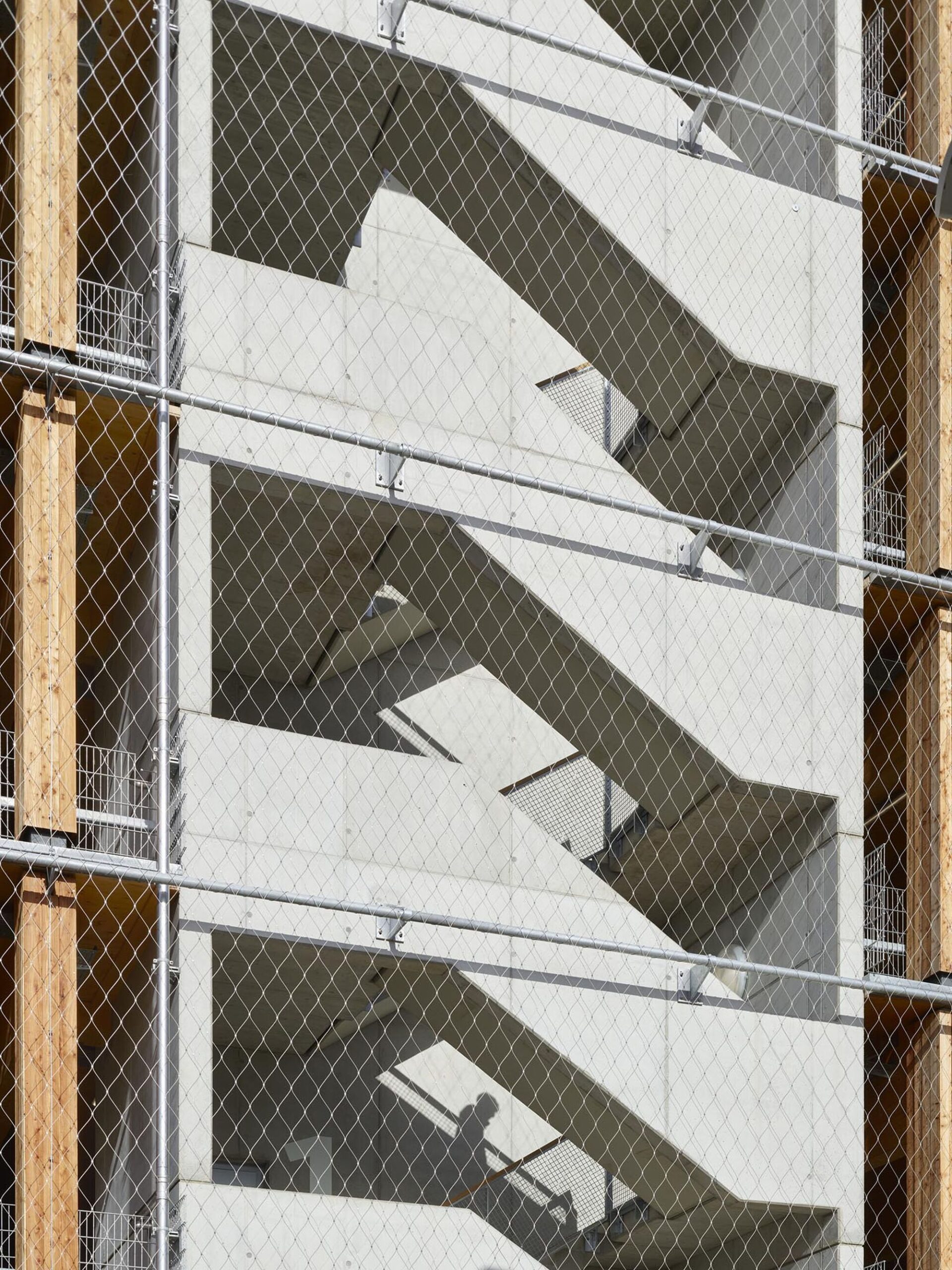 The lightweight construction method and the minimal use of CO 2 -intensive materials such as steel and concrete meant that large amounts of CO 2 could be saved. In order to ensure the recyclability of the building, no composite materials were used and almost all connections were plugged and screwed together. This guarantees easy dismantling, separation by type and thus the reusability of the materials. The convertibility of the building is also guaranteed, as the storey heights are planned with a clear height of 2.35 m and between the beams with a height of 3.40 m and not with a height of 2.10 m like a conventional parking garage. The height and the absence of columns thus allow the parking garage to be converted into a residential or working environment with a beautiful, naturally lit inner courtyard in place of the centrally located ramp.
