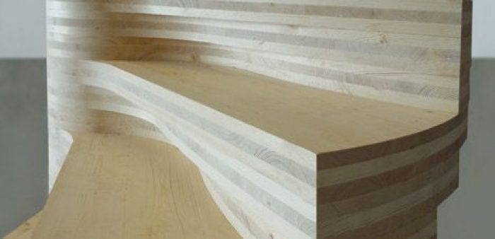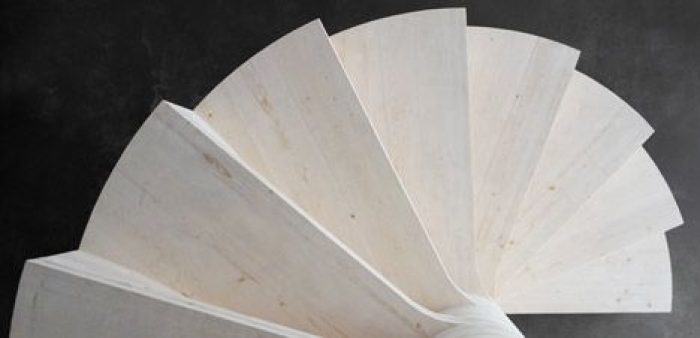 Every step in this wooden spiral staircase is formed by a combination of three layers. The lower layer in each step is craved in a concave shape to increase tread’s surface closed to the central column, so that also increases area for walking on and reduces the weight of the structure and the amount of material used. The central column gives the impression of solid cylinder due to the layered formation of the steps.