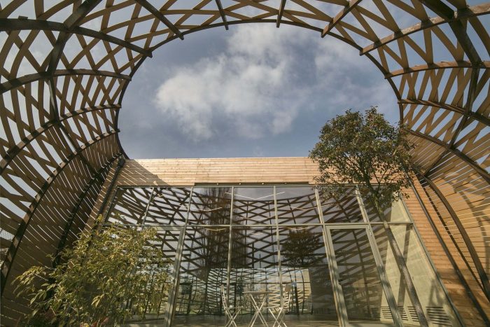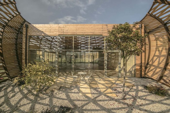 Community symbolic landmark. The dance school facade is woven with wood veneer. The curved external shading system provides shading while maintaining the overall simplicity of the building. The package on the facade also forms two small garden terraces, which helps to shield the internal space and ensure the privacy of the classroom.