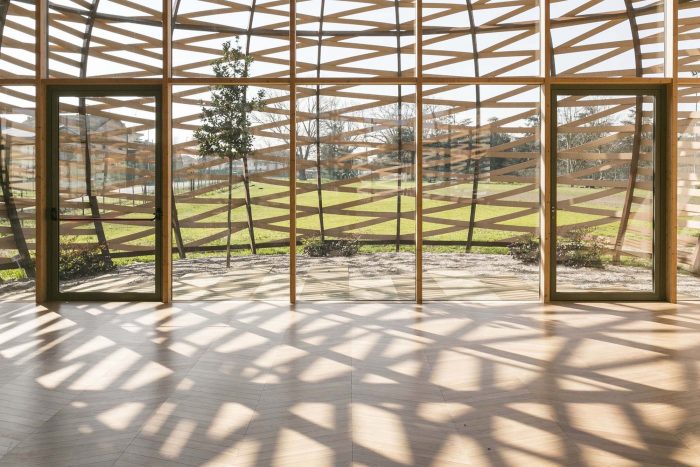 Architecture and Plan. The new dance school is designed to replace the old building damaged by the earthquake. The building adopts a rectangular plan and is equipped with a fir wood structure and wood veneer. The use of natural materials is conducive to reducing the damage to the environment and protecting the fragile ecosystem after the earthquake.