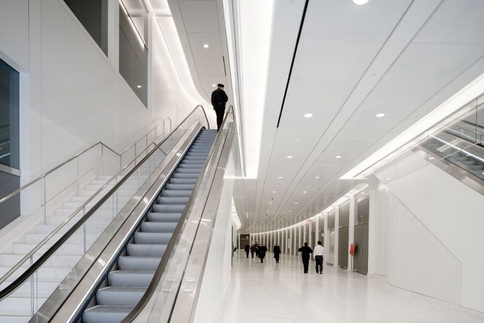 Two level retail space is expected to open by August with Kate Spade, Apple and Michael Kors among the leaseholders. Escalators, elevators and stairs provide access to the upper and lower retail concourse levels. The terminal will be illuminated at night. The Oculus’ wings were supposed to move but this kinetic element was removed due to cost reduction.