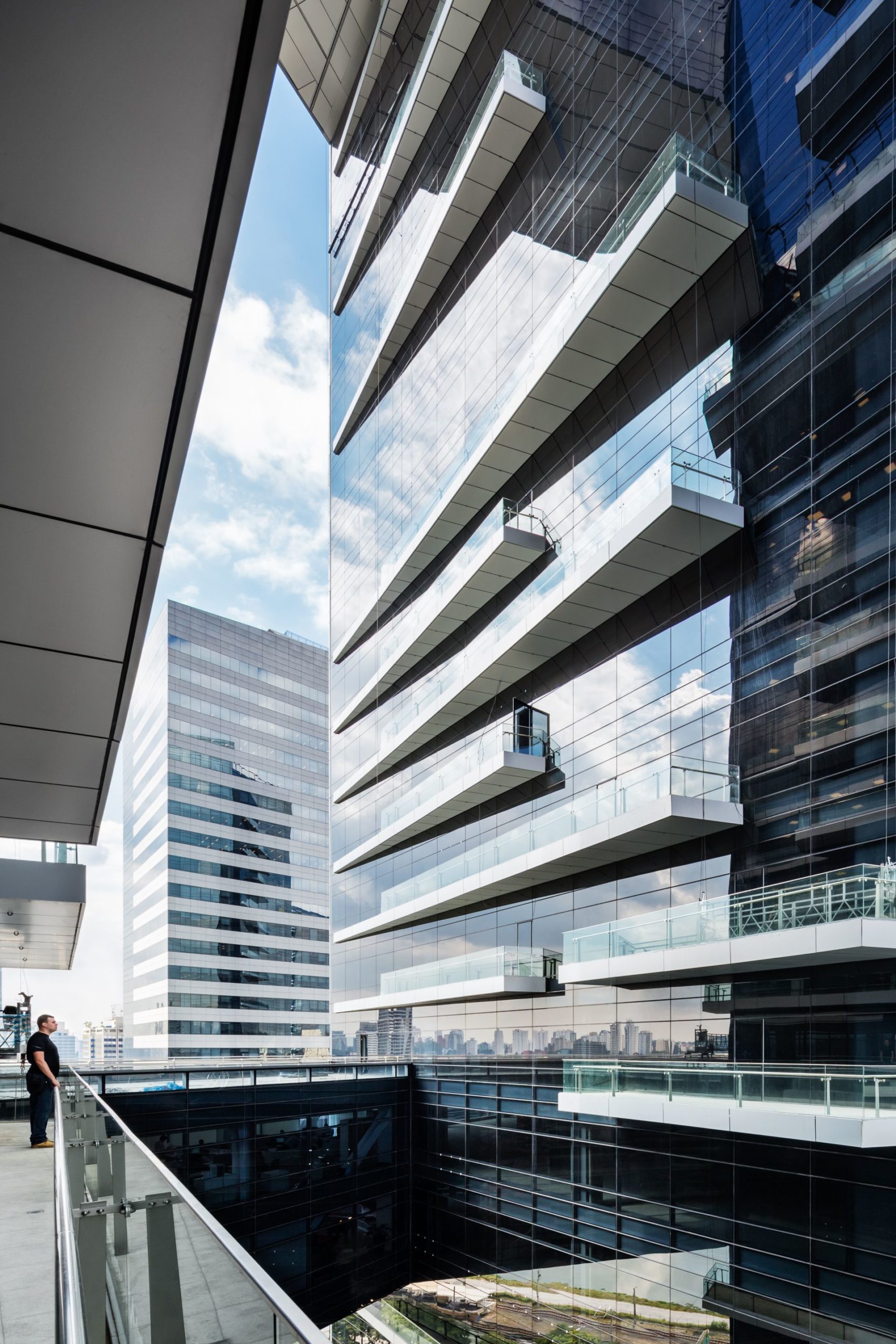 WT Morumbi, Two identical towers but in inverted positions, connected on the ground floor and on four standard upper floors by bridge-like structures between the towers thus characterizing a single building.The building’s east-west placement along its major axis favors the more extensive facades with minimal heat gain, pointing the smaller facades towards the sunrise and sunset.Each tower has an independent access and two sets of elevators which thus define both lobbies.
