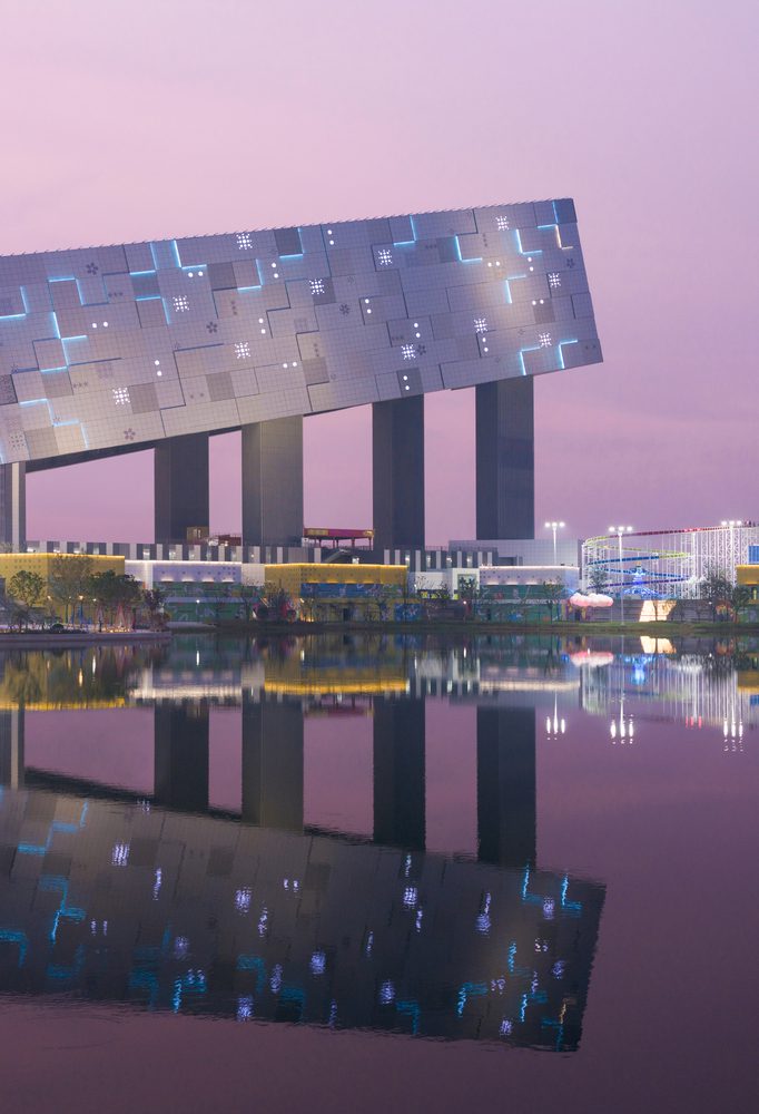 Wuhan Ski Resort, A variety of entertainment, sports, and retail facilities groups around a central lake to form a super-large commercial complex, with architecture and facades in complementary scales of terraced three-dimensional pixels.