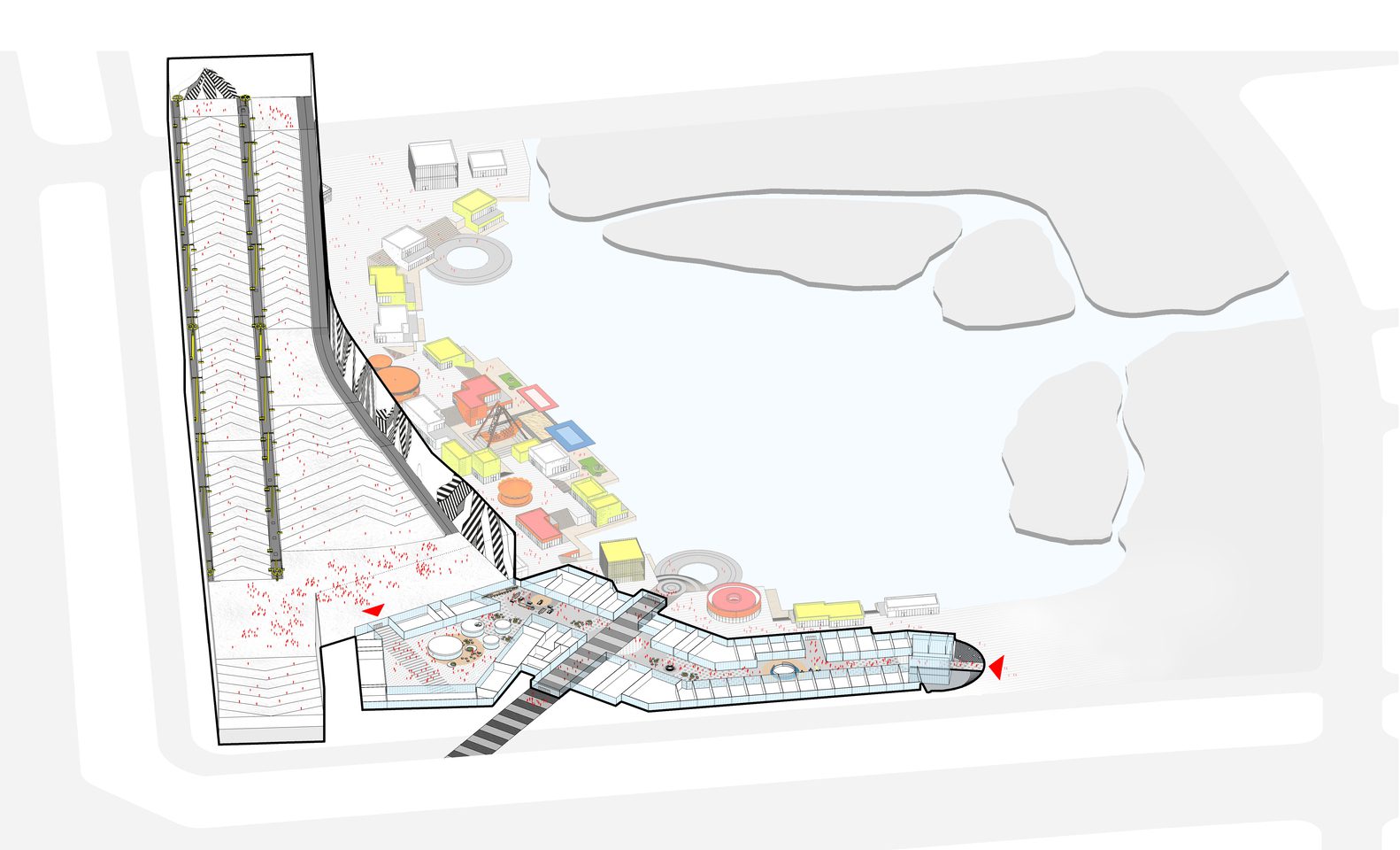 Indoor-outdoor urban living room. Below the half-kilometer-long and 100m high indoor ski slope with its pixelated multi-media façade, foothills full of sports and nightlife venues scatter towards the waterside, linking plazas and retail streets with generously landscaped areas and interactive facades. Indoor spaces dissolve into the outdoors, to activate internal and external retail areas with entertainment facilities and landscapes, and to connect to the adjacent transportation nodes.