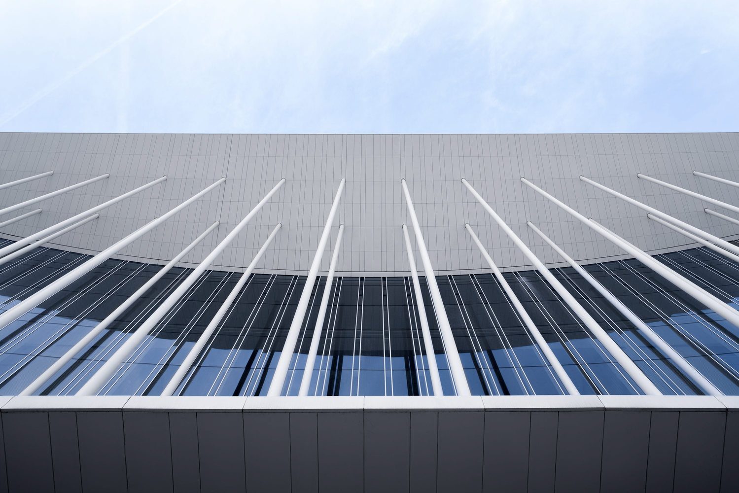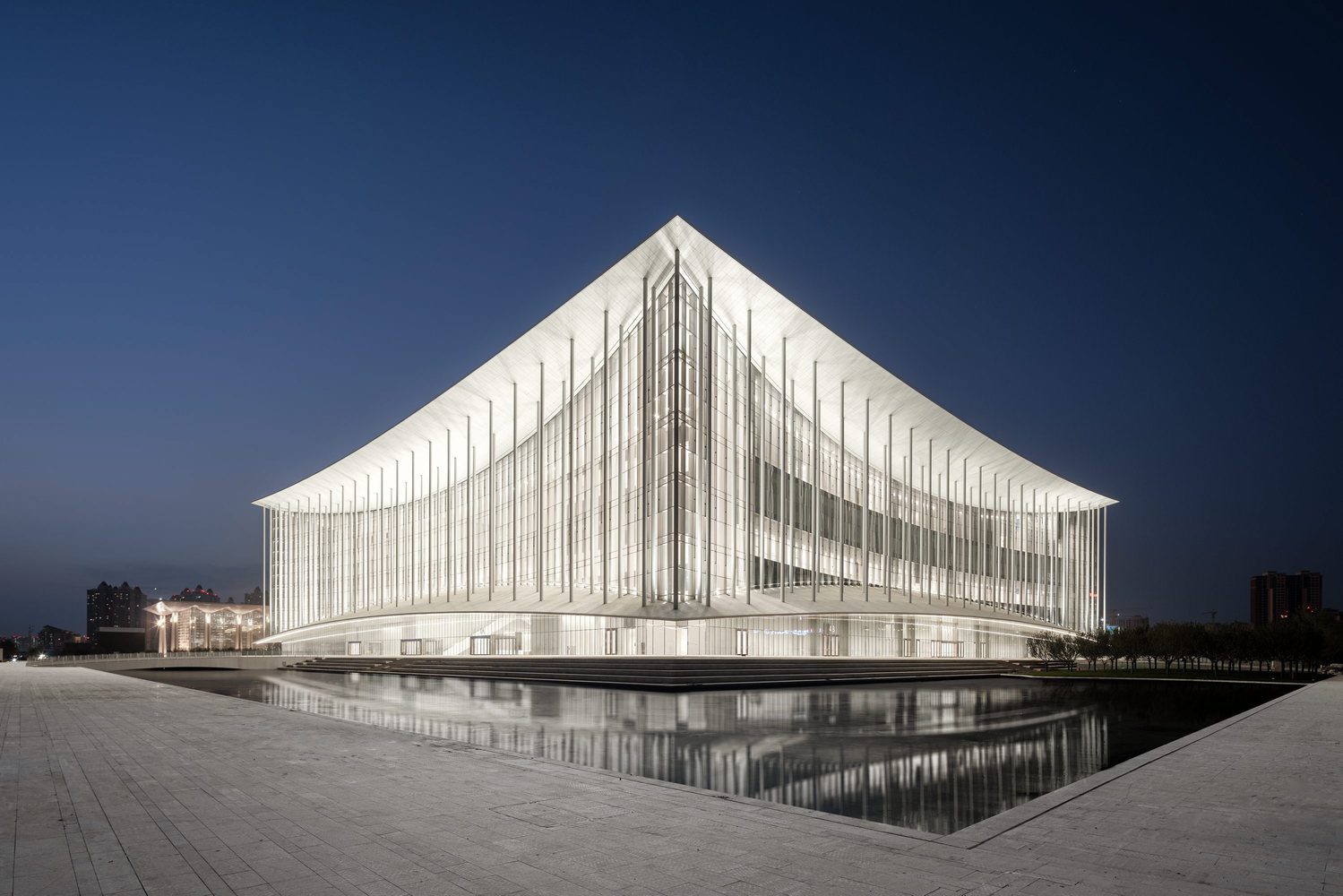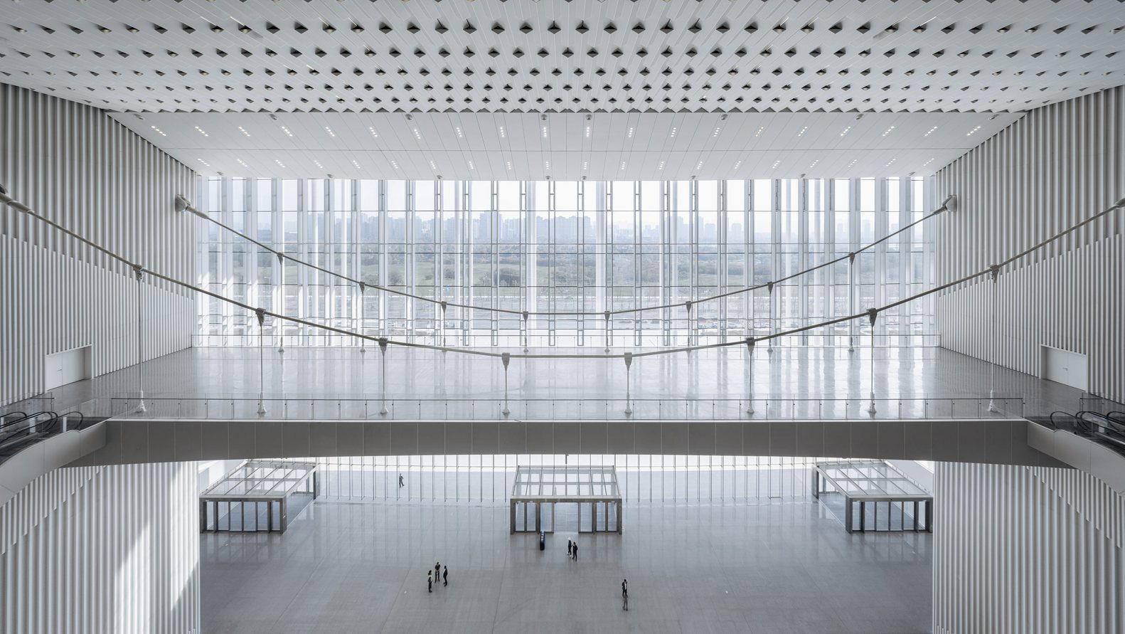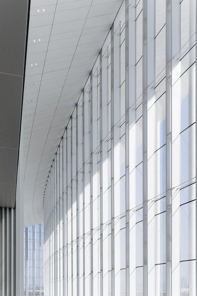The suspension is achieved using 180 elegant steel columns with lengths of between 30 and 40 meters and a diameter of 0.6 meters that provide a dynamic structure and emphasis to the facade. Viewed from across the river, the internally illuminated white half-moons appear as a landmark for Xi’an that can be seen from afar.