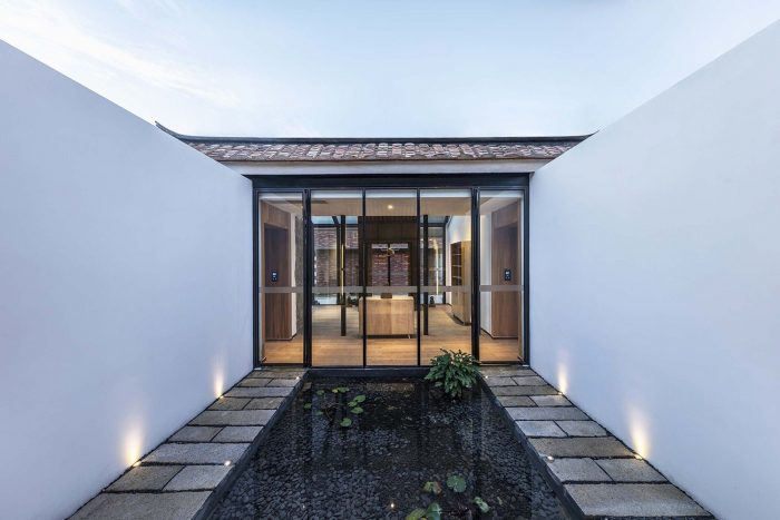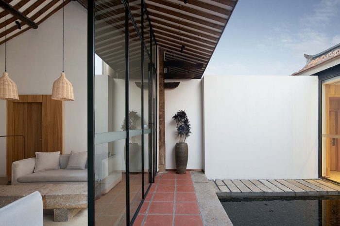 Building No.2 collapsed at the first entrance hall and the first half of the kitchen. The original wooden structure is about to collapse, and there is a gate that still stands. Two wing rooms in the middle were also collapsed, and a cow was raised in the middle. Considering that the building is just at the intersection of the active line in the village, a steel structure frame is designed in the entrance hall and the right wing room to support the original wooden structure, and large glass is used to show the outside to increase the permeability and improve the relationship with the neighborhood. The two wing rooms of atrium and patio are treated in the same simple and clear way like Building No.