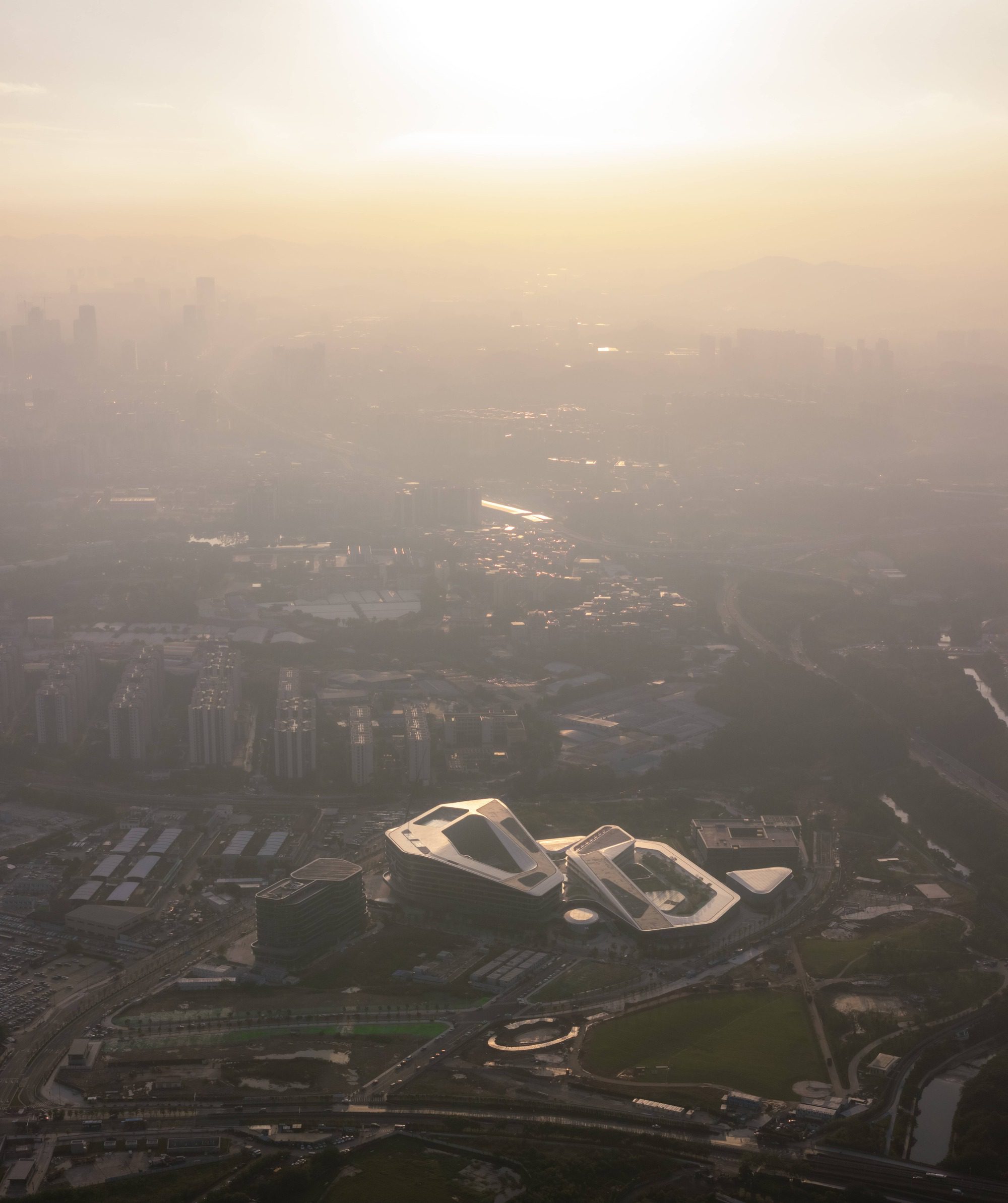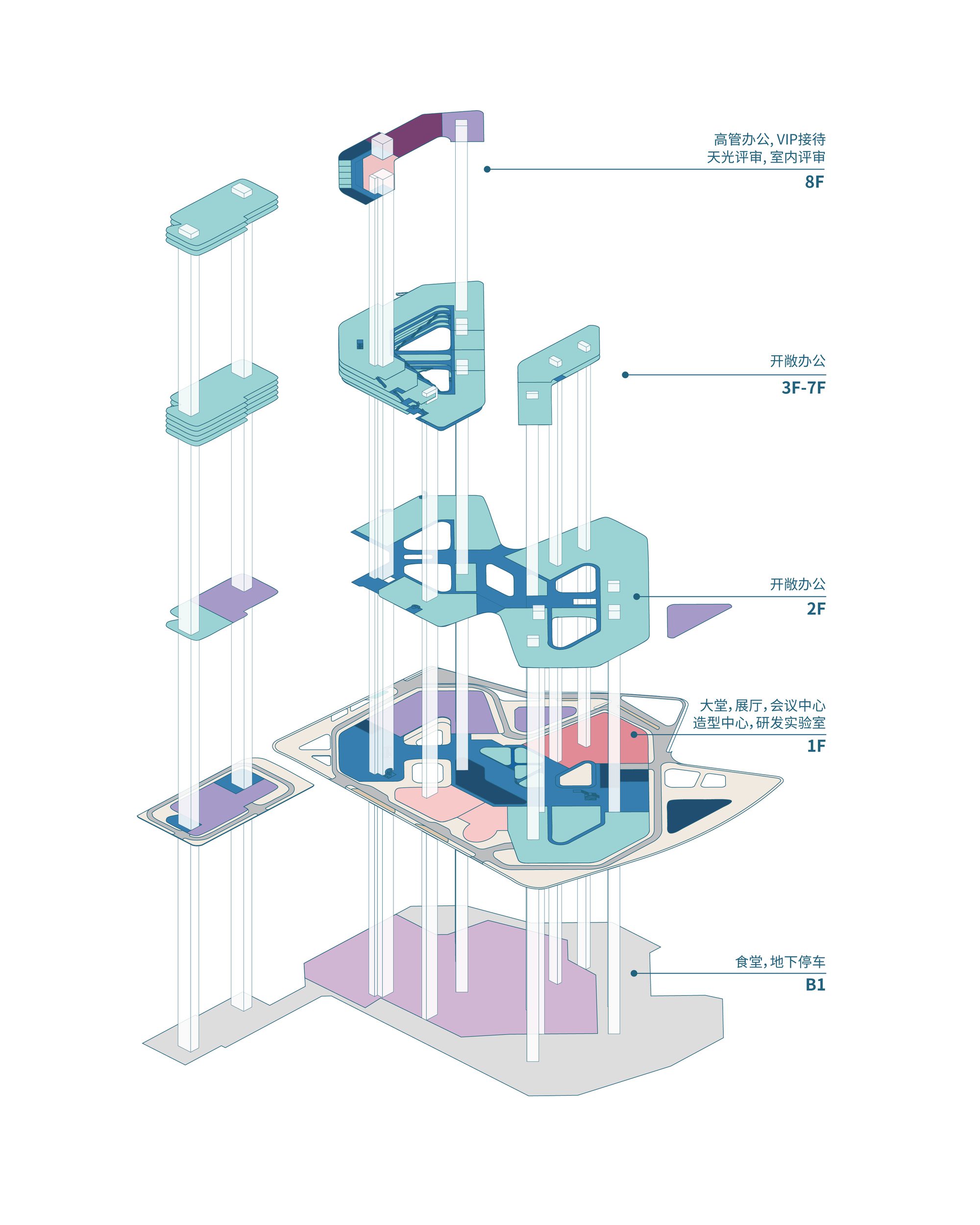 Beyond common functions such as offices, R&D, reception, and exhibition spaces, the entire complex integrates core industrial functions including automotive engineering R&D, interior and exterior automotive styling assessment, and new vehicle testing. Relatively independent facilities located outside the main buildings include an XPENG flagship store, a shared conference center, and a flying car takeoff and landing site, making the overall complex a truly large-scale technological hub with a complete industrial ecosystem. The rooftop features green photovoltaics, sports facilities, an outdoor aircraft landing platform, and waterfront landscapes, forming a rich open space integrated with the city.