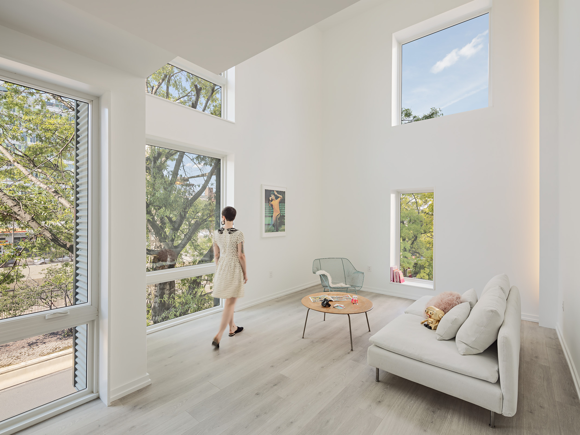 The expanded envelope approach to this project emphasizes vertical living. A single shared stair runs up through the center of the project and individual unit stairs unlock mezzanine levels. Despite being a three-story building, the 63-foot-tall section connects seven levels of occupied space within its very small footprint.