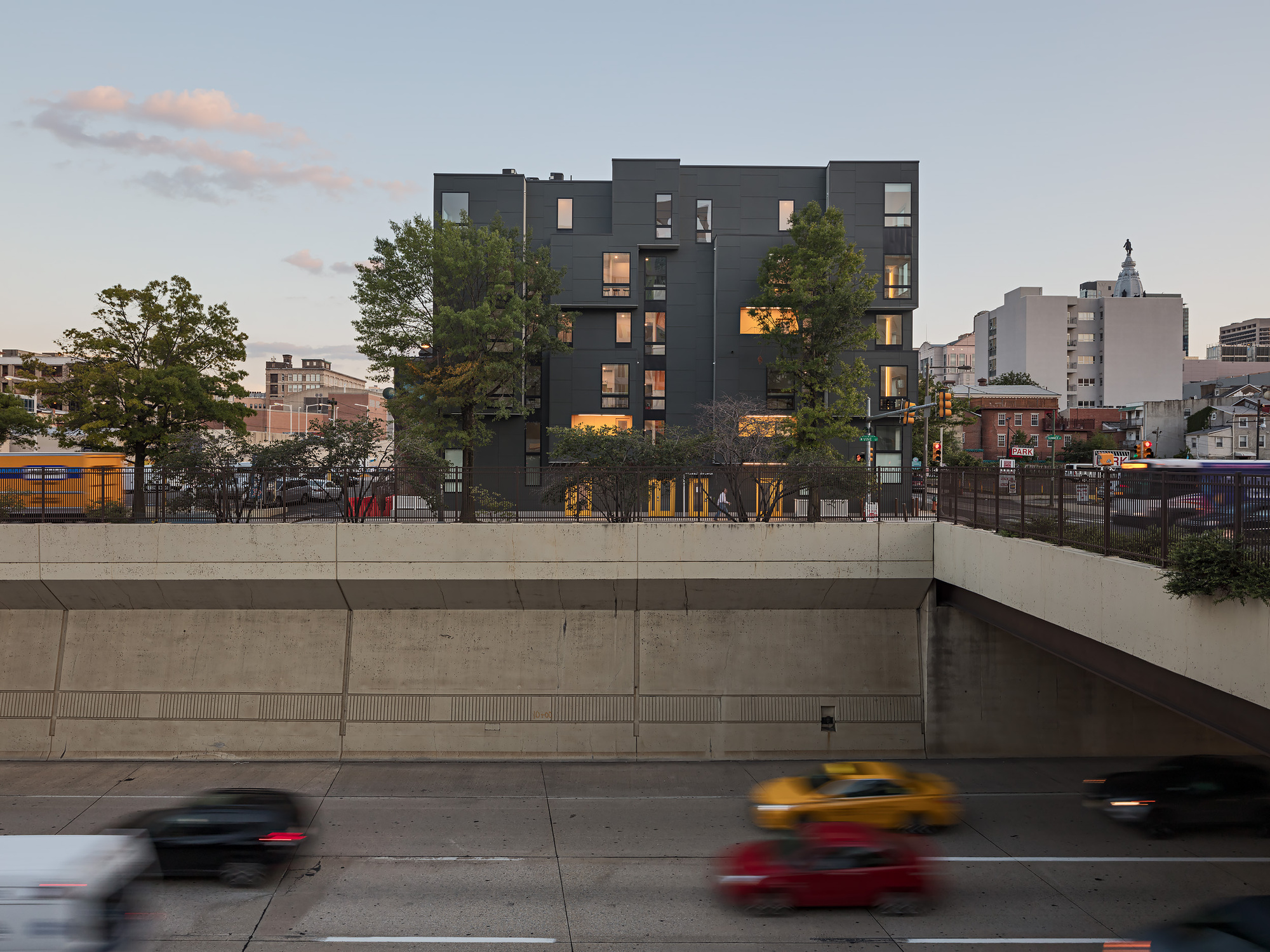 Philadelphia’s urban renewal era left behind an east-west cut through the city’s urban fabric in the form of the sunken, 100-foot-wide Vine Street Expressway. Philadelphia’s Chinatown neighborhood was one of those disconnected by the expressway, with many of its formerly densely inhabited blocks sliced into odd shapes and sizes. Today, the expressway continues to divide pedestrian activity, while most of the odd-shaped leftover lots are used for surface parking. XS House rejuvenates one such leftover site, adding urban density and street life while encouraging walkable lifestyles.