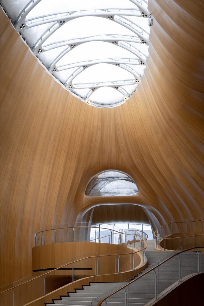 Sunlight from the central skylight floods the wood-clad lobby, which maintains a commanding presence within the central axis of the center. Additional light features are embedded throughout the structure to illuminate the dynamic activity taking place inside while ETFE, a lightweight and translucent plastic polymer, is integrated into the curtain wall structure to diffuse light throughout the interior. The lobby can function as a temporary performance space thanks to an acoustic design using wood panels with .4mm micro-perforations.