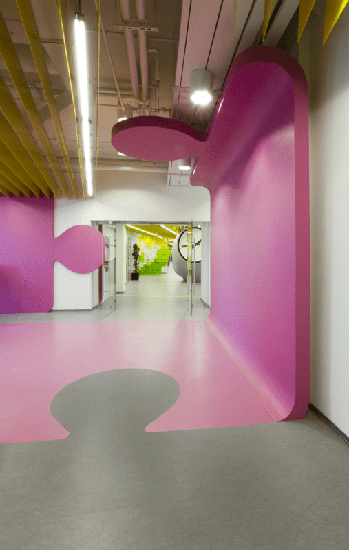 The office guests receive a unique transcendental background, the one of which Aldous Huxley hadn’t even dreamed of. Visitors find themselves both in an amazing space which architects had transformed from linear into 3D, observing the pixel objects which grew to gigantic proportions. Thus, according to the architects conception, guests and employees of the office are involved into Yandex net services, to which they are accustomed to work with exclusively in 2D screen. That is why in some places miniature «icons», which grew to giant size are breaking to large volume «pixels» sprouting from the walls. Bright colors, spots scattered here and there, guide visitors through the office and cheering up the office staff.