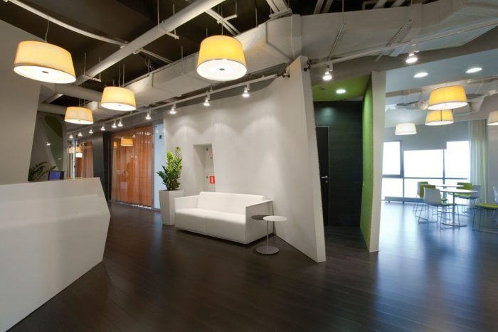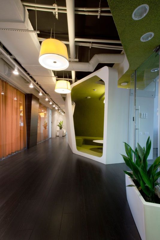 Architects and companies discovered that space and their characteristics influence the productivity of it’s users . To do this and to transform areas of work environments more into more comfortable spaces, za bor Architects, calculated the luminal level to properly organize the light of offices, as well as the sound levels, covering the ceilings with acoustic panels. The entire interior of this office is a place of contrasts of color. The architects built white spaces and furniture to contrast with the dark wood floors, green terracotta furniture and furnishings somehow break the feeling of an monochromatic interior . Za bor Architects obtained this way an office with a young and dynamic atmosphere , without losing the comfort and Optimal conditions necessary for the functioning of the entire system .