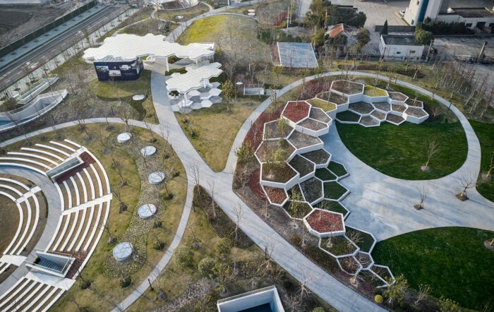 In the project(Phase I), the functional organization takes “theater scene” as the theme, and the design closely integrates the small theater, outdoor theater, underground commercial service facilities and terrain landscape. The overall architecture and landscape aim to achieve the integration and reshaping of the natural texture and the industrial memory of Yangpu Riverside. The design is based on the principle of maximizing compliance with the current landscape, and maximizing the sustainable water cycle of natural accumulation, natural penetration and natural purification of rainwater, creating a natural, comfortable, ecological and harmonious public space for the public.