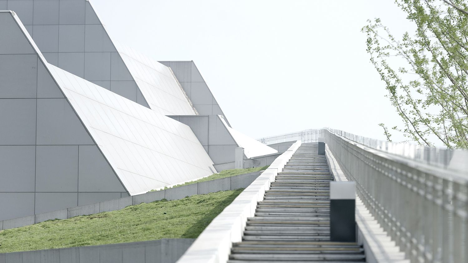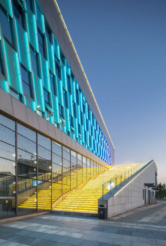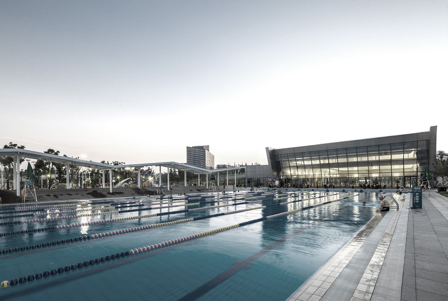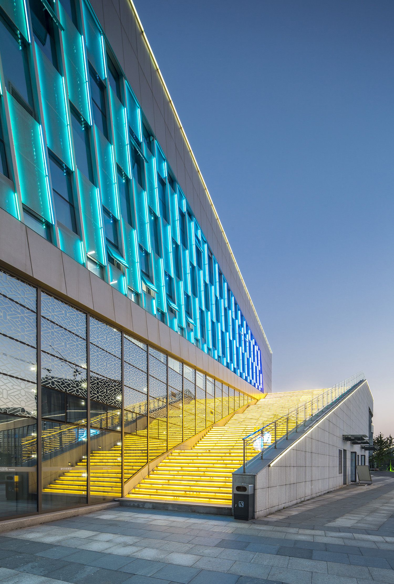 Yangzhou Li Ning Sports Park is built based on the principle that integrates modern city functions with traditional historical culture, thus creating sustainable modern sports facilities that reflect the contemporary lifestyle. Located within the Sports Park in Guangling New City, the project has broken the building volume into pieces by adopting the design philosophy of landscape architecture. As an integral part of the park, the buildings reflect Yangzhou’s spirit of including both mountains and water in traditional parks by combining the artificial “built mountains” with the “natural water” in the area, which provides the city with a vibrant center with its sports culture. In recent years, China’s sports industry has gradually transformed from prioritizing competitive sports to developing public sports. The design has kept up with the change, avoiding simplification in function deployment. Modern leisure sports functions such as rock climbing and trampolining have been introduced on the basis of traditional sports activities. Meanwhile, relevant derived functions have also been introduced such as sports training, health maintenance, and rehabilitation, and catering services, offering the community an area for complex activities.