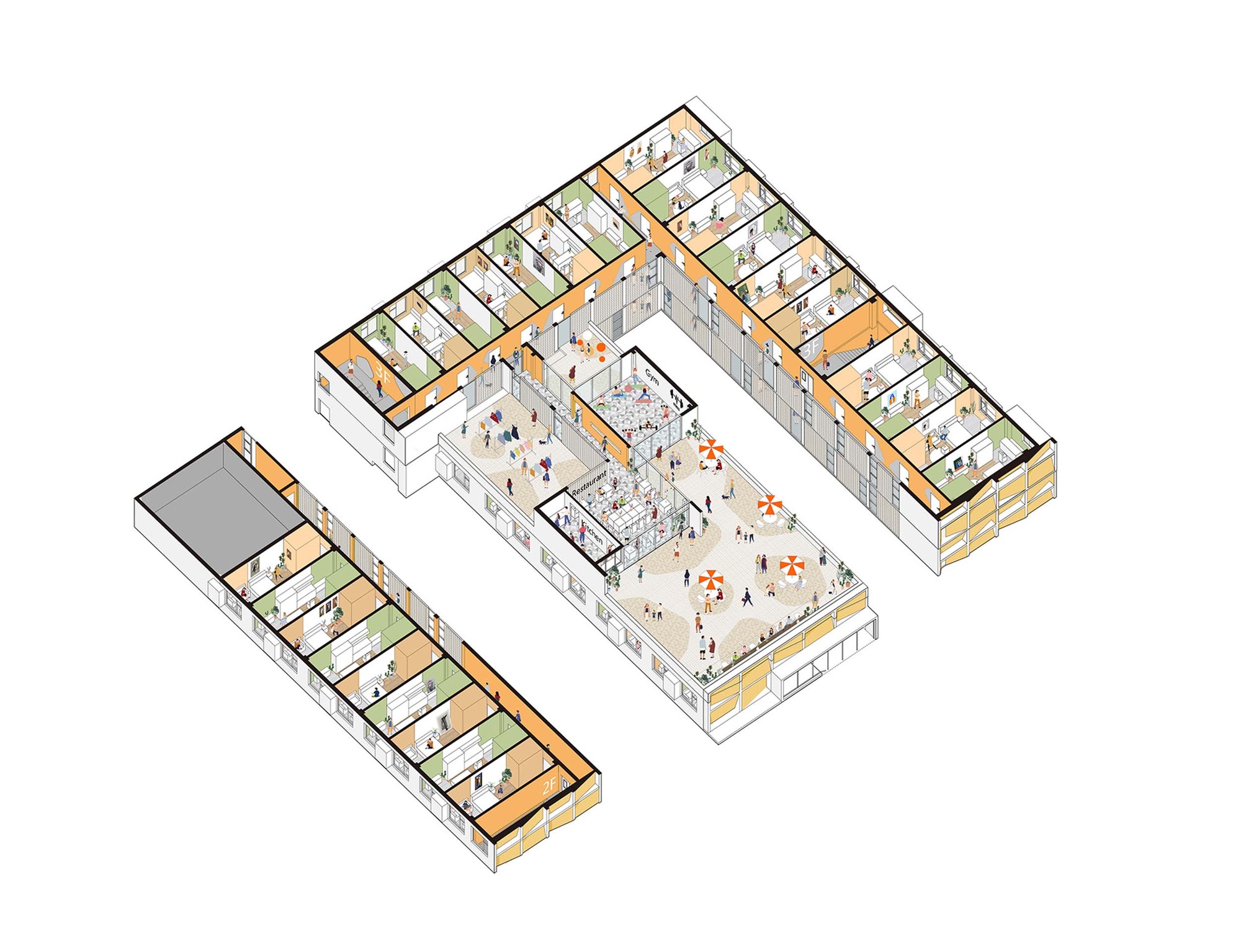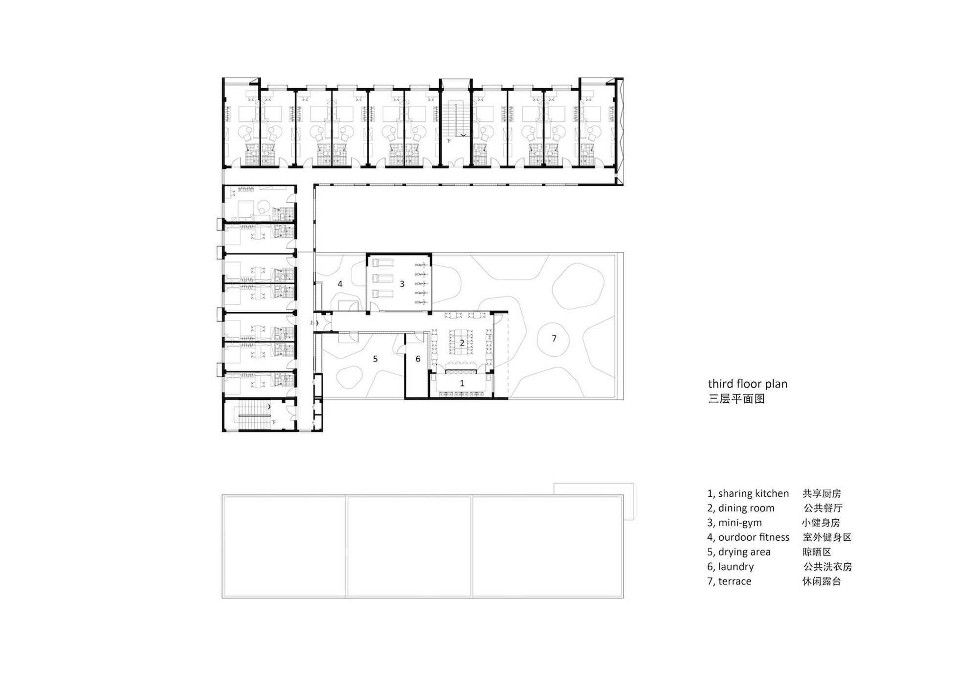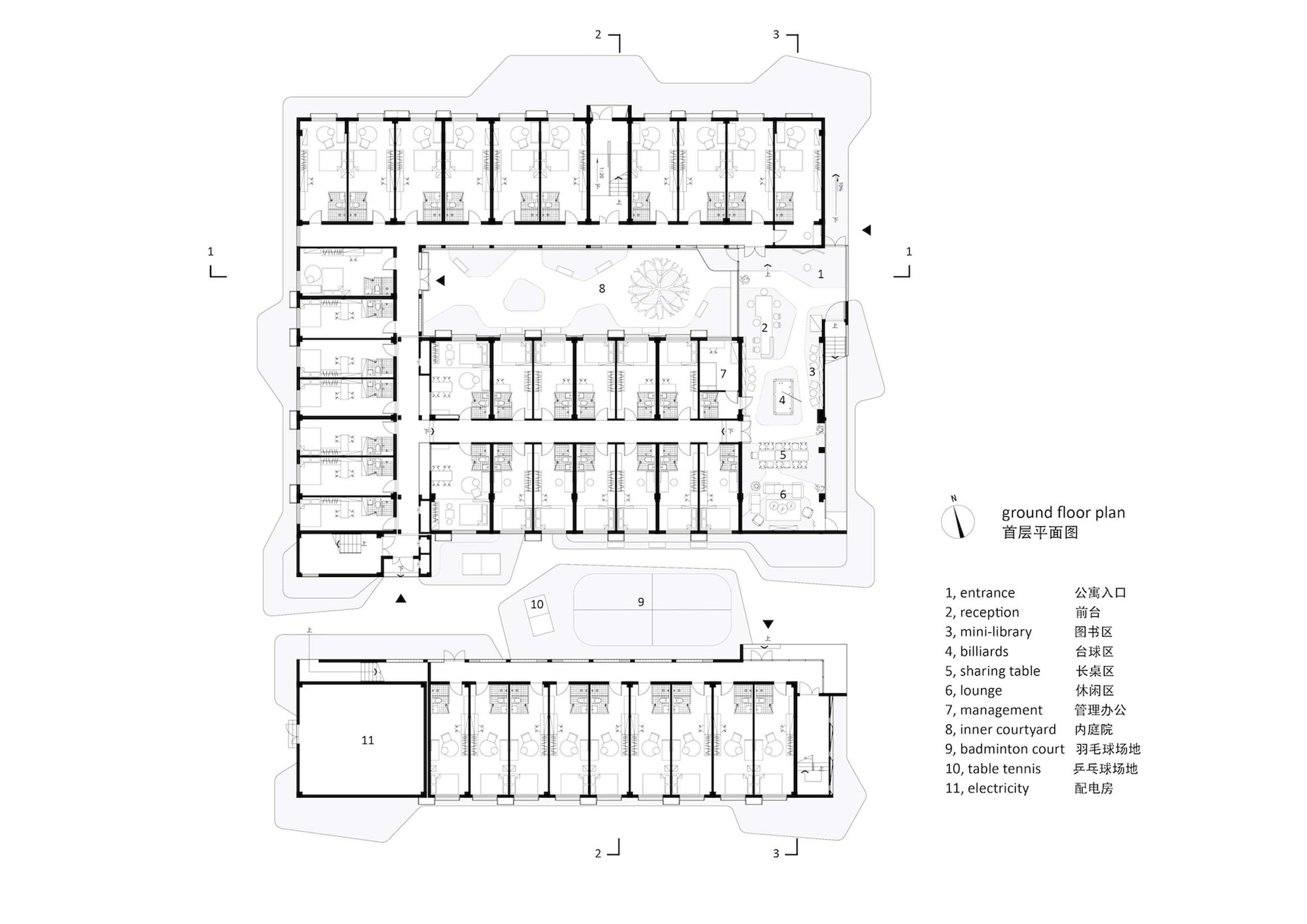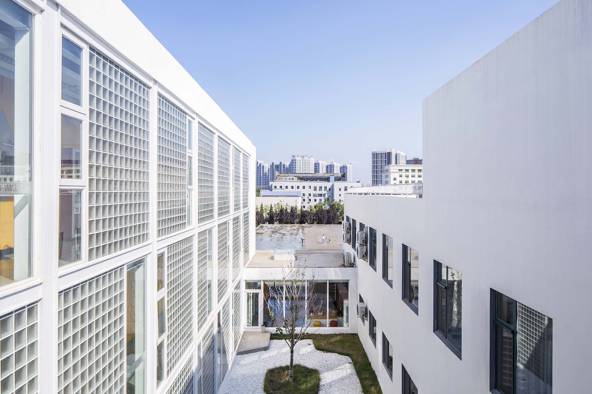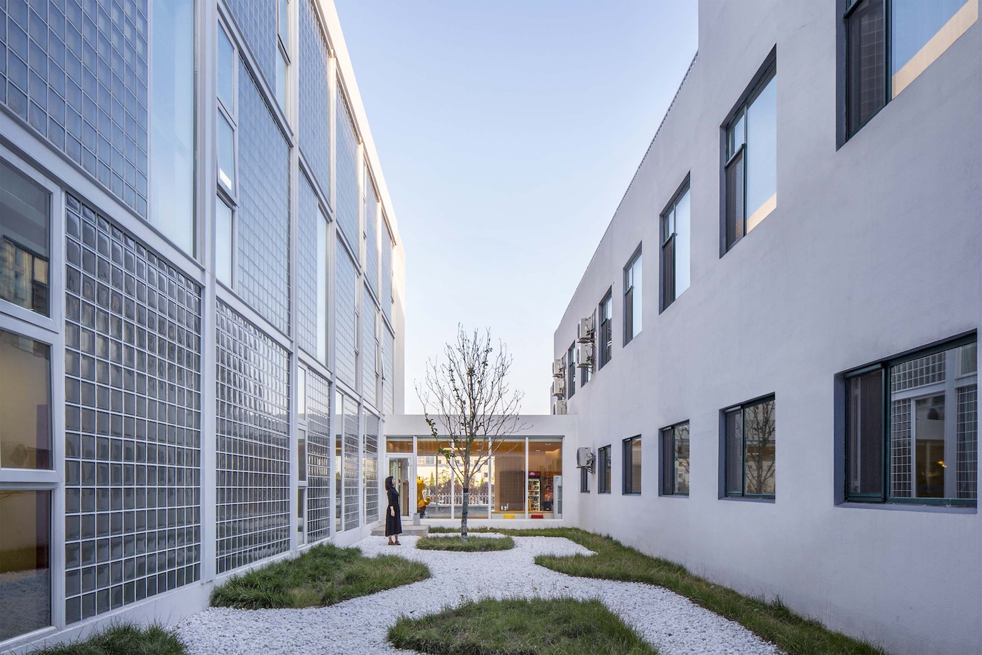 The original three-story building was limited in depth, in order to get a larger inside space; we add a new corridor as spinal transportation to connect each part of the apartment. The exterior wall of the corridor is made of artistic glass brick, and it forms a quiet courtyard together with the added lobby. On the roof of the original two-story storehouse, there are also some communal spaces for the youth apartment, such as dining, kitchen, laundry and fitness. The terrace is also faced to the open green space on the east, and it is the most popular outdoor space for social and leisure.