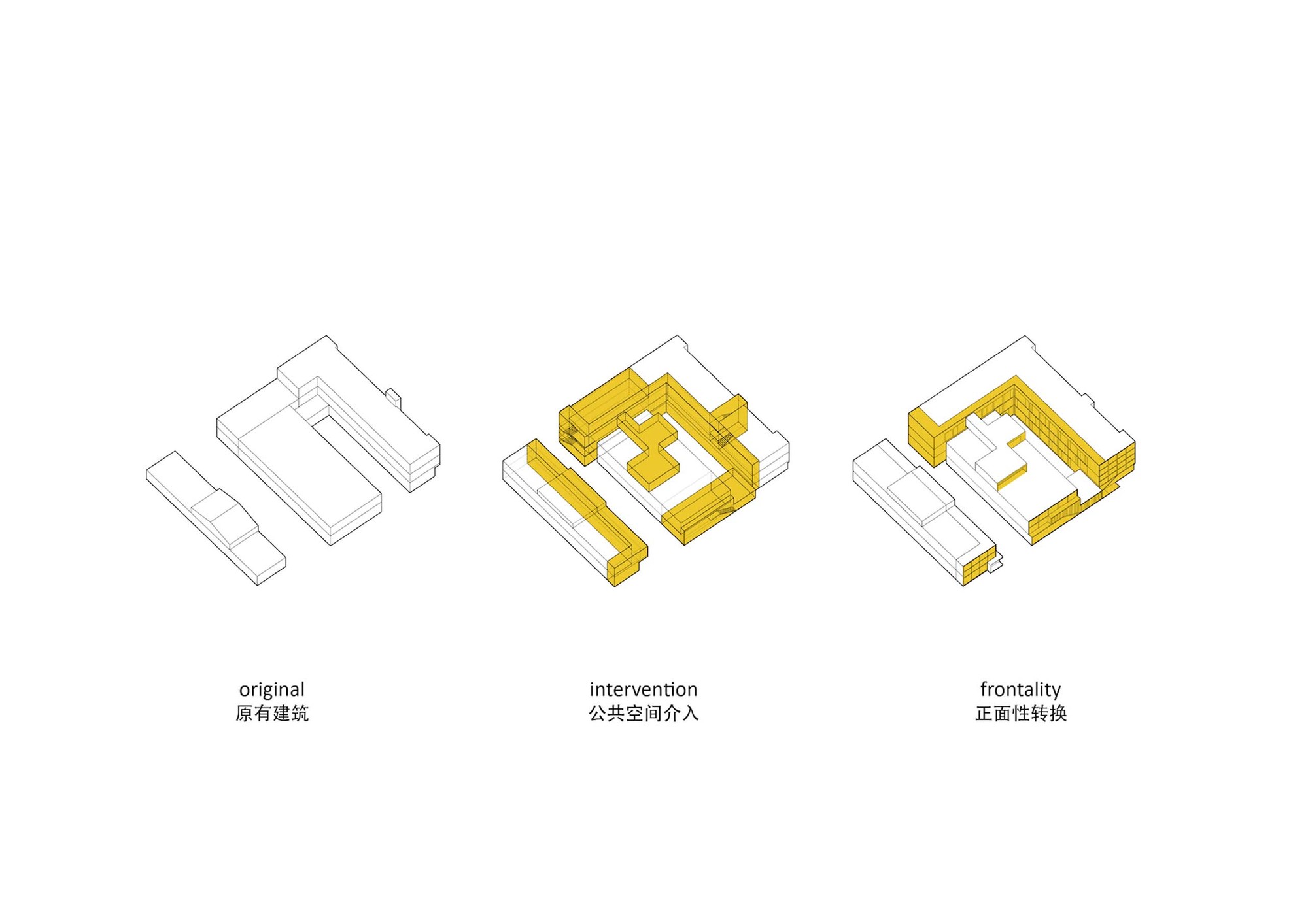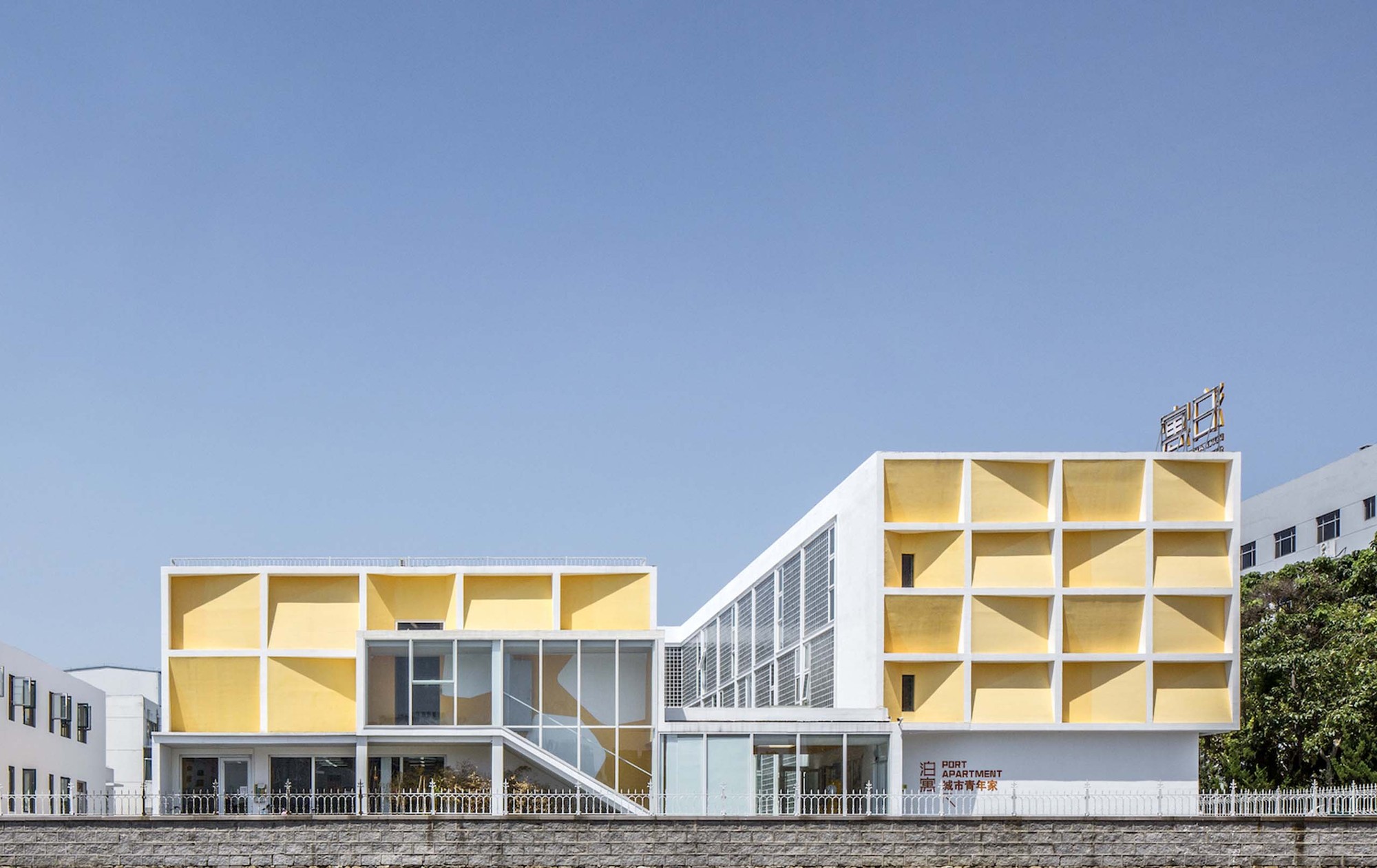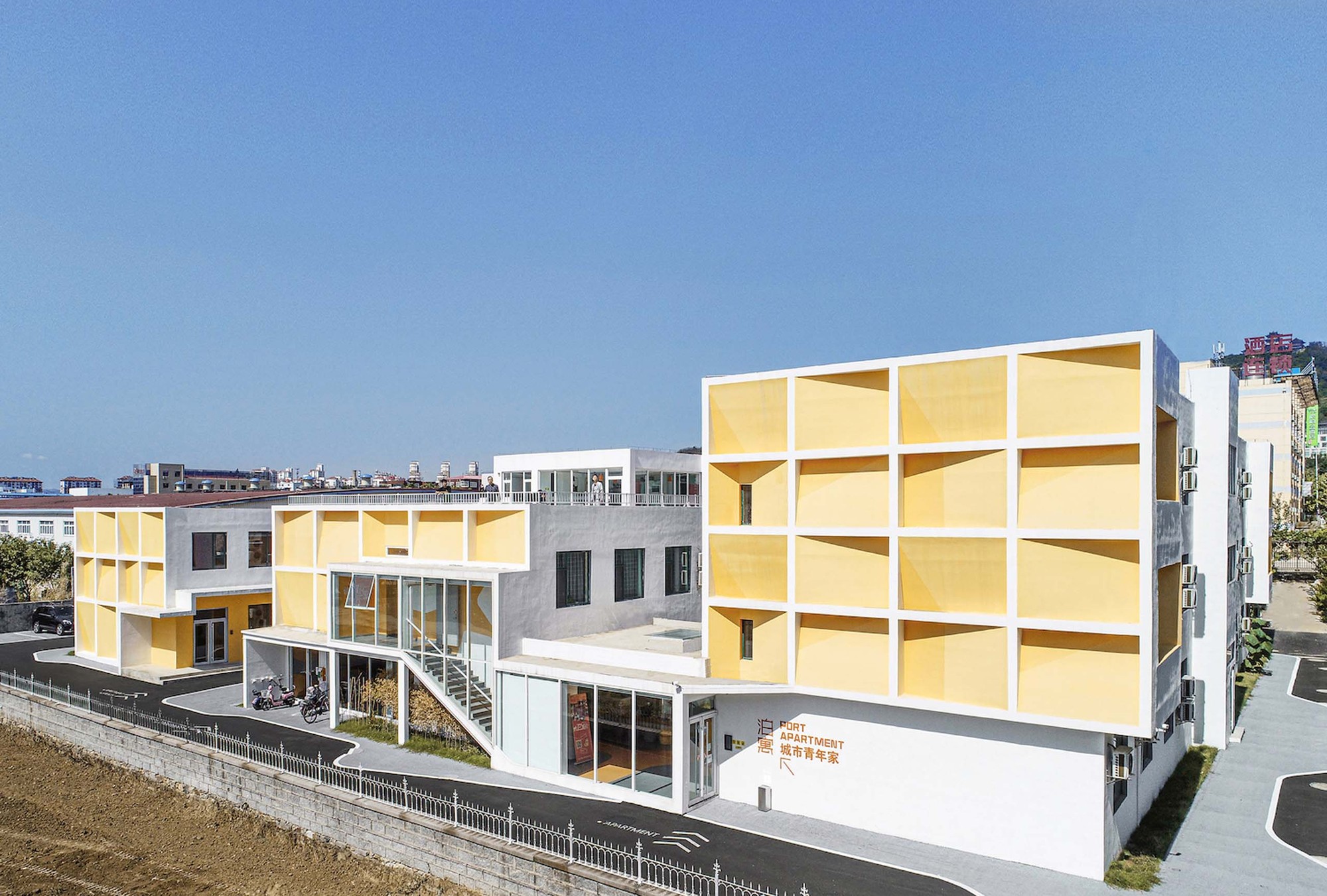 In The Origin of Works of Art, Heidegger mentions: “ The work is to be a work, only because the field the work opens up…to be a work means to set up a world”. For architectural works, to set up a world could also be understood as the establishment of a place. The renovation design for Yantai Chunhui Road youth apartment is no doubt experimental: it is not only a functional rearrangement to the original industrial building, but also an effort to find out the spiritual correspondence of the coastal city and the youth apartment. We adjust the relationship of the building and its surrounding city by manipulating the frontality on different directions; we create an unique and recognizable place for the youth apartment through the implantation of the artistic use of color and shadow on the façade; and we also trying to bring a sharing lifestyle and living experience for young people by the spatial design inside and outside.