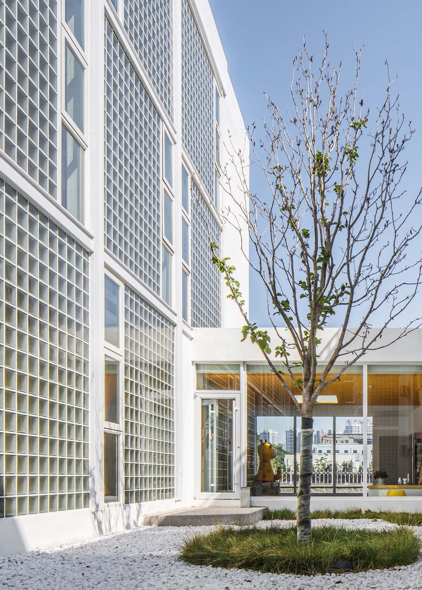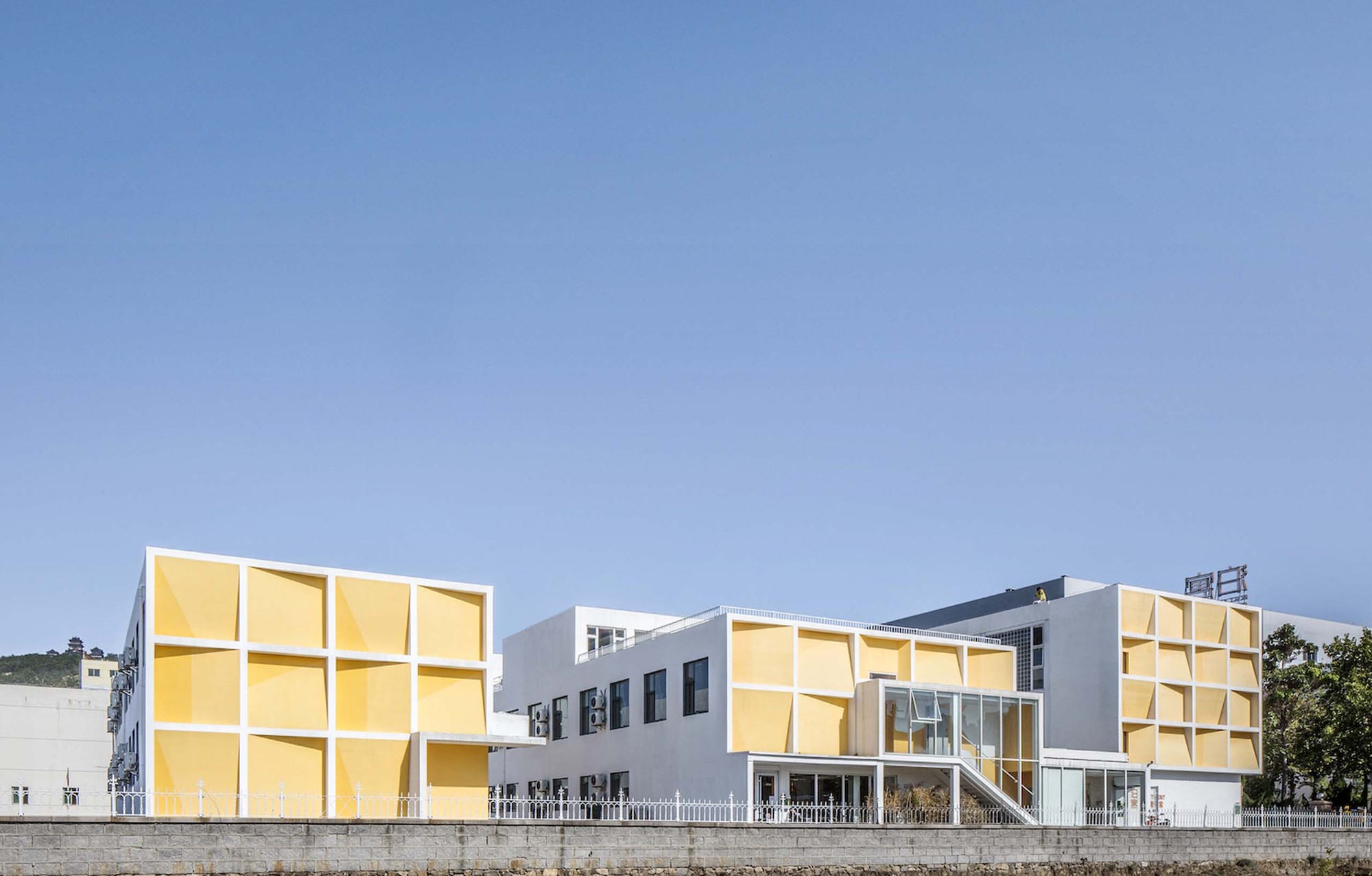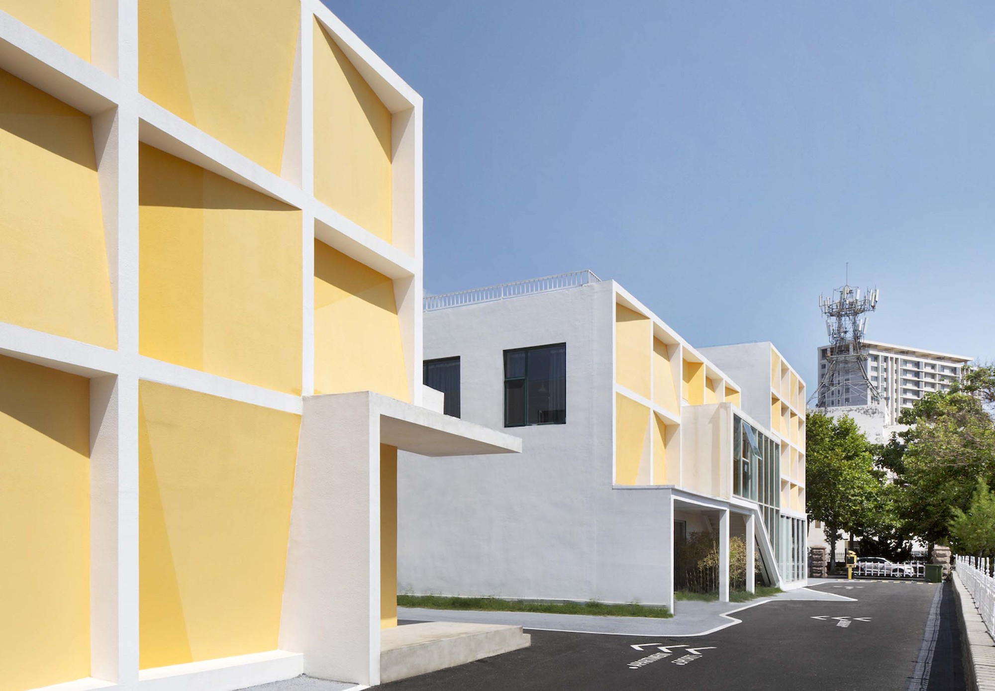 The frontality of the east elevation is consisted of simple square façade language. We make the artistic design by the angle changes of the inner wall within each square. The orange and yellow painting simulates the shadow projected on the inner walls under different angle. And on a sunny morning, there will be a rich and interesting light and shadow changes at different time. The contrast between this large-area of white and orange wall also coordinate the coastal city spirit under the blue sky.