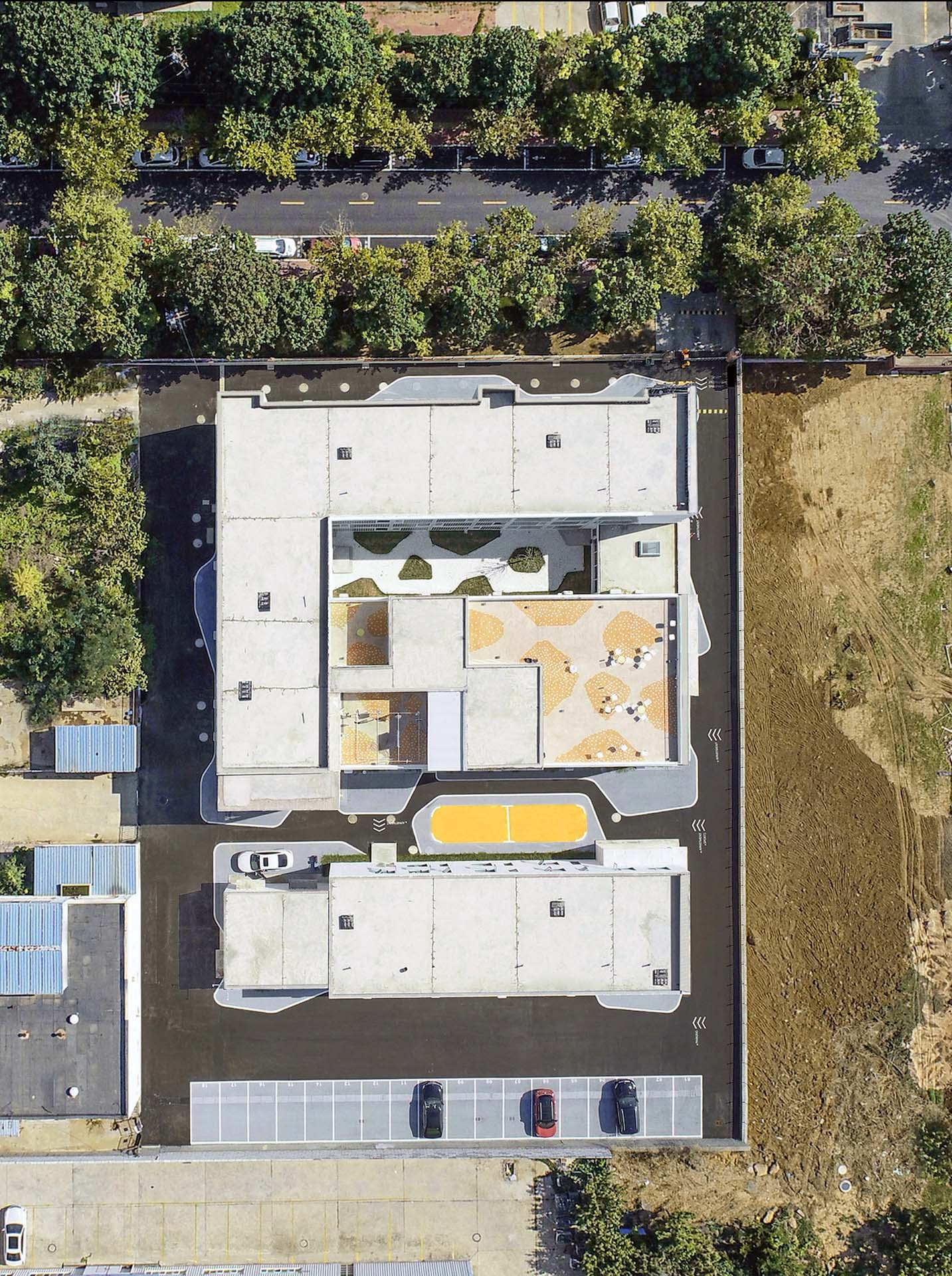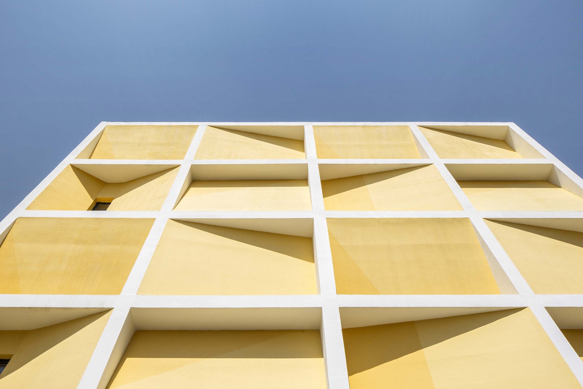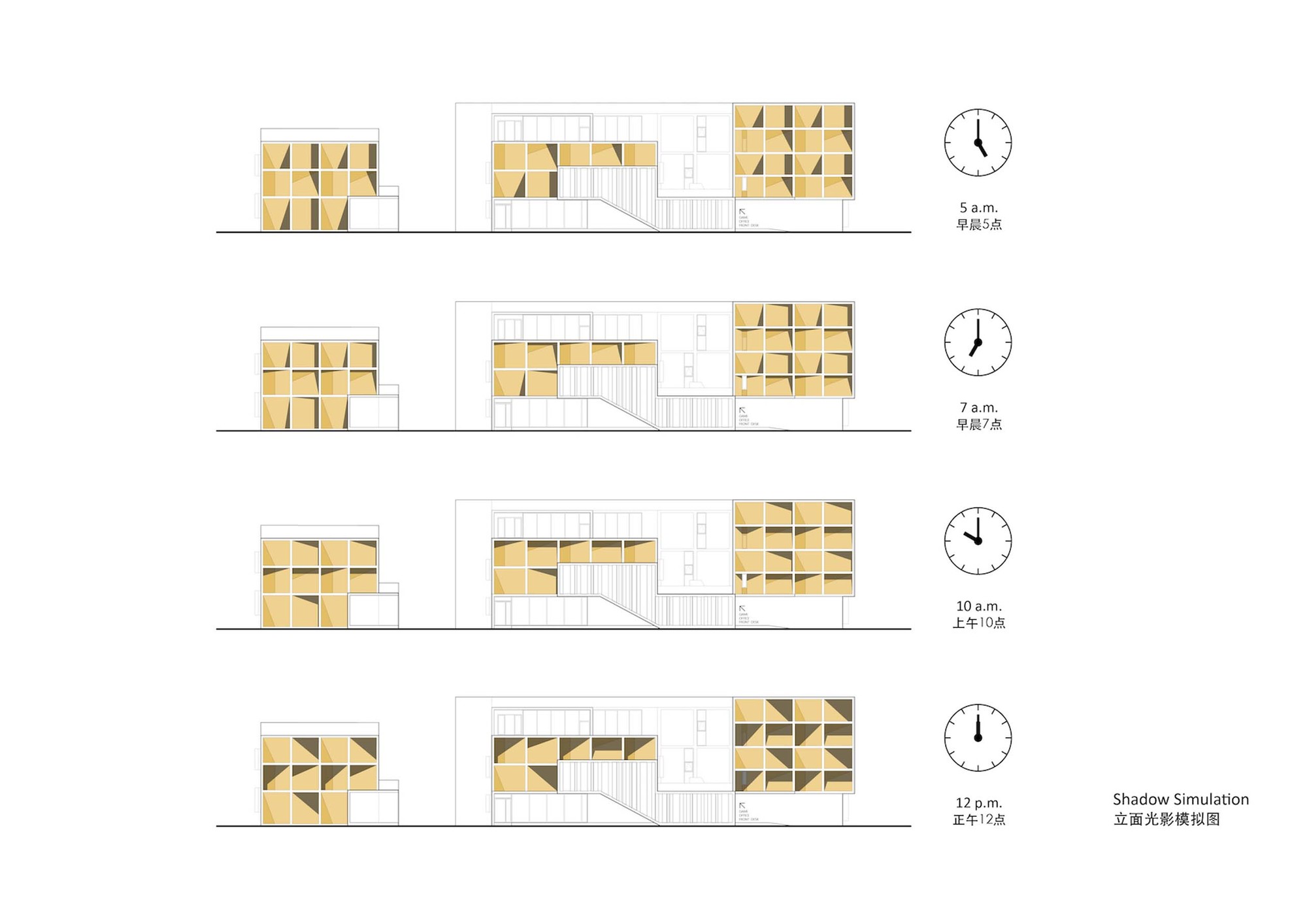 The frontality of the east elevation is consisted of simple square façade language. We make the artistic design by the angle changes of the inner wall within each square. The orange and yellow painting simulates the shadow projected on the inner walls under different angle. And on a sunny morning, there will be a rich and interesting light and shadow changes at different time. The contrast between this large-area of white and orange wall also coordinate the coastal city spirit under the blue sky.