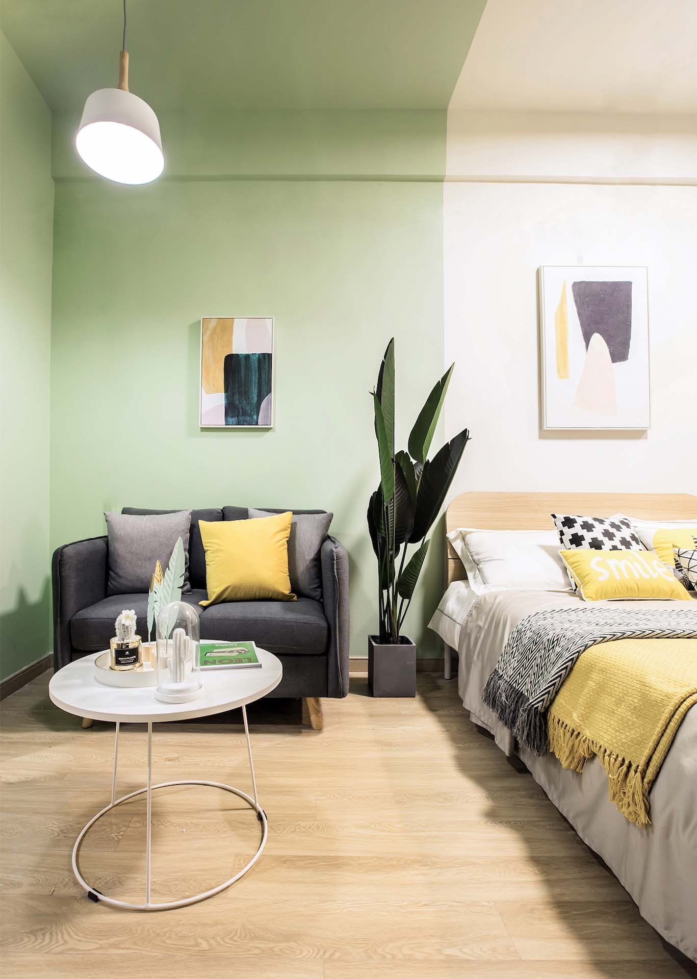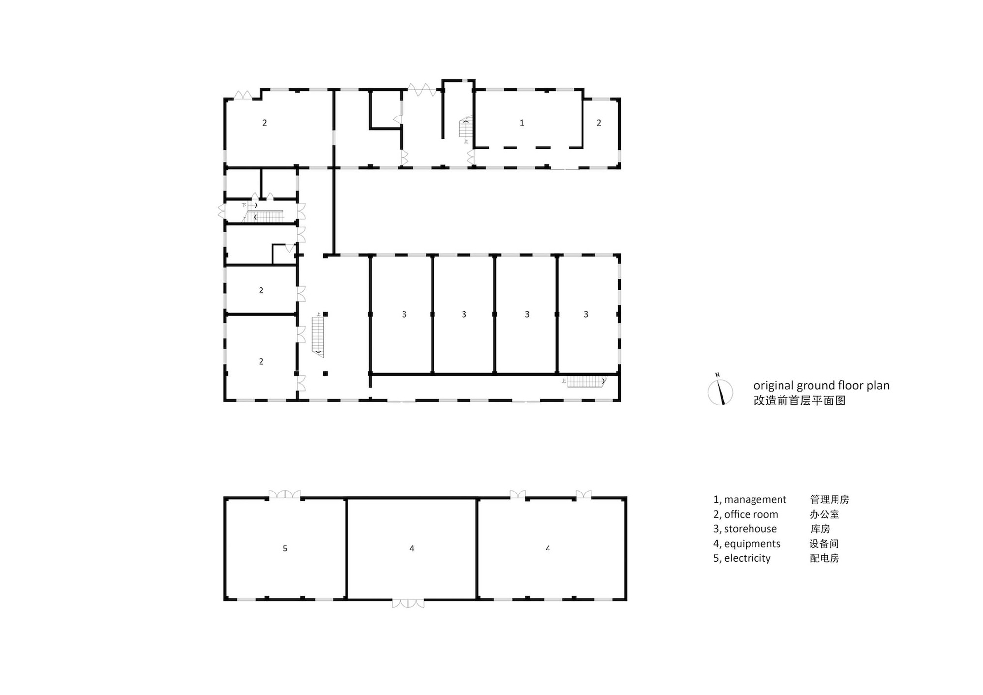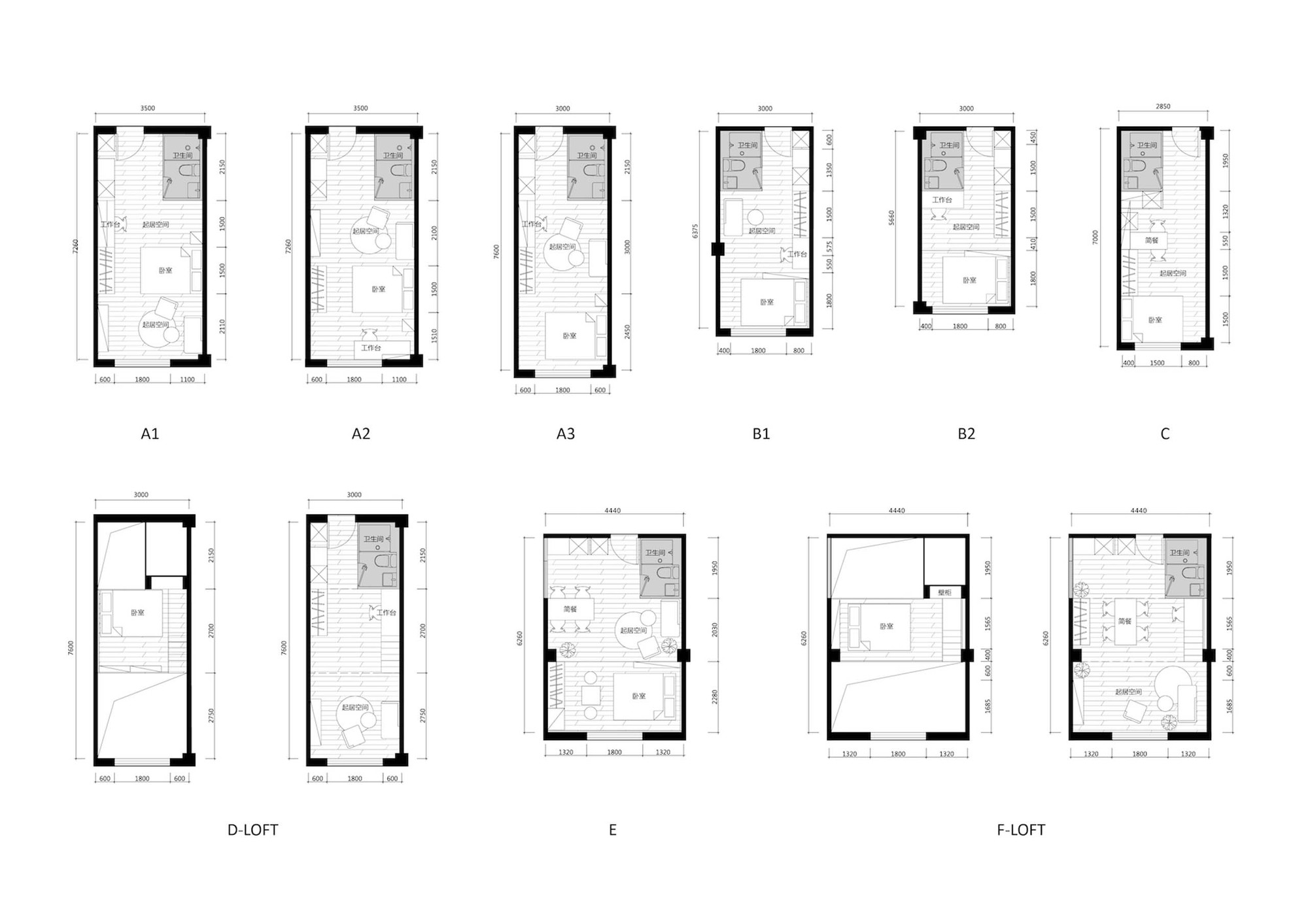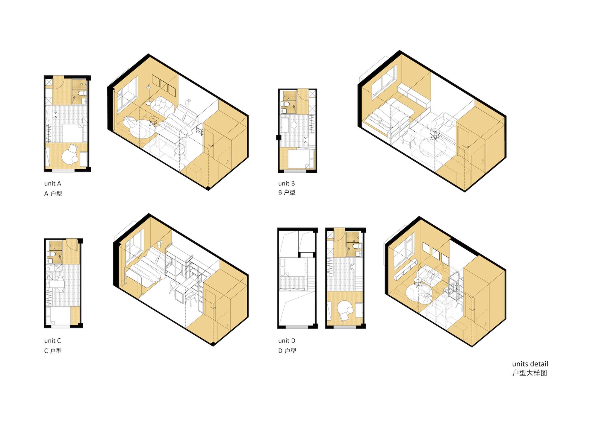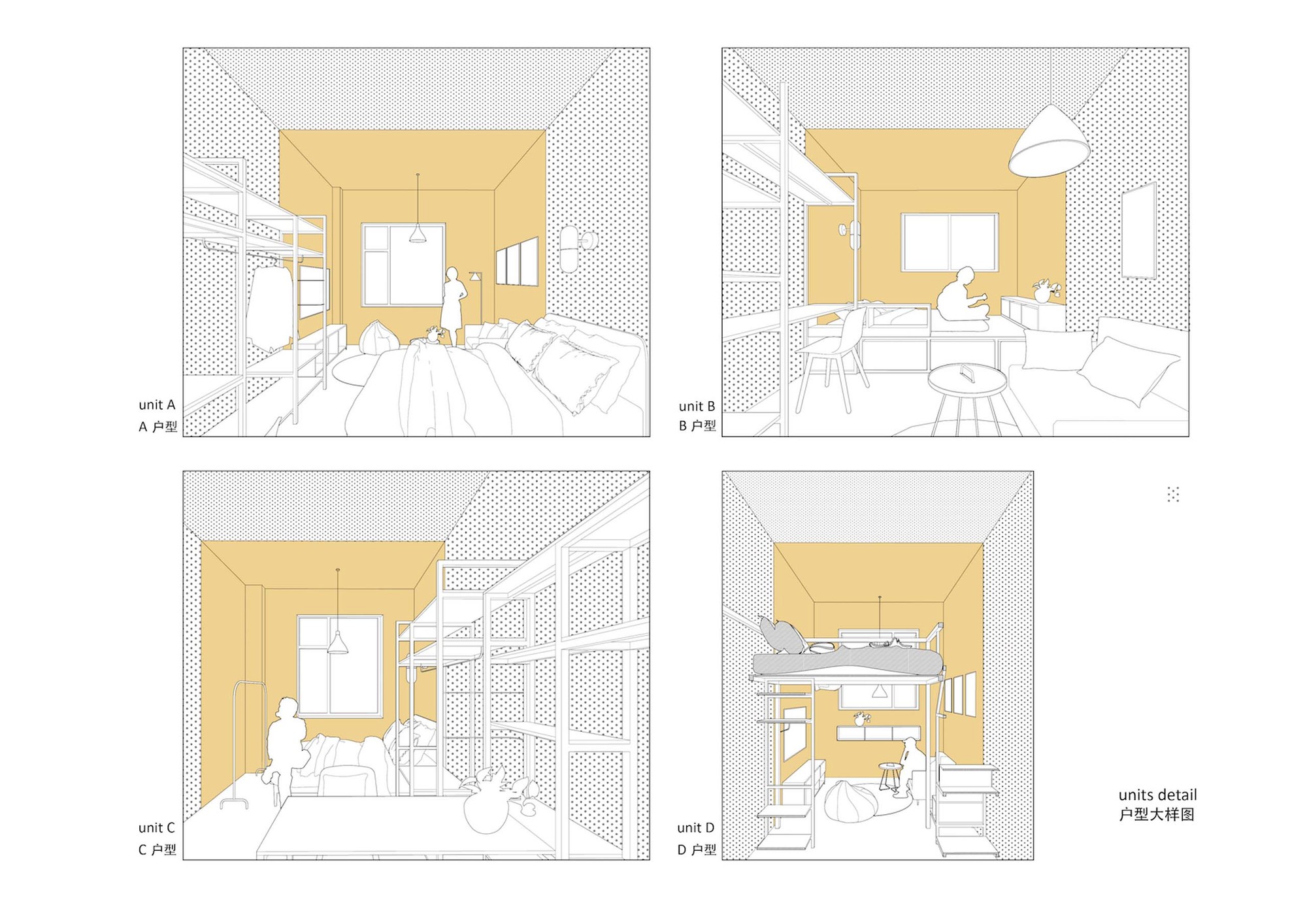 There are 102 rooms in total in this apartment, with 5 room types, depth from 5.6 meters to 7.6 meters. Each unit is divided into 3 or 4 modular partitions, which are entrance and bathroom, living area, sleeping area and extended workspace in sequence, each part is distinguished by different painting colors. We also introduce a LOFT type duo to the perfect height on the second floor of the original storehouse, and to separate the living area and the sleeping space. This typological and systematic arrangement enlarges the interior space in each unit, and could also increase the living condition by a clear functional zoning.