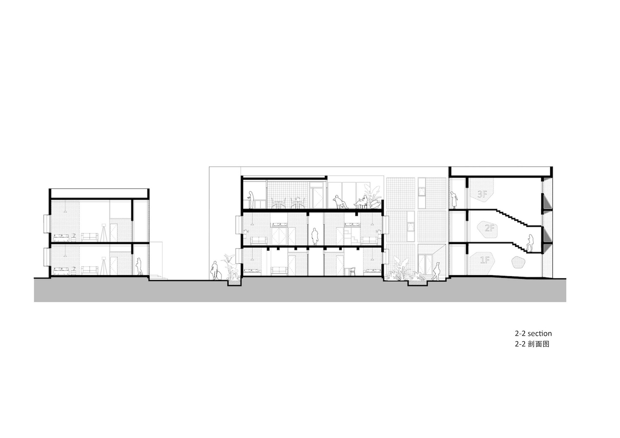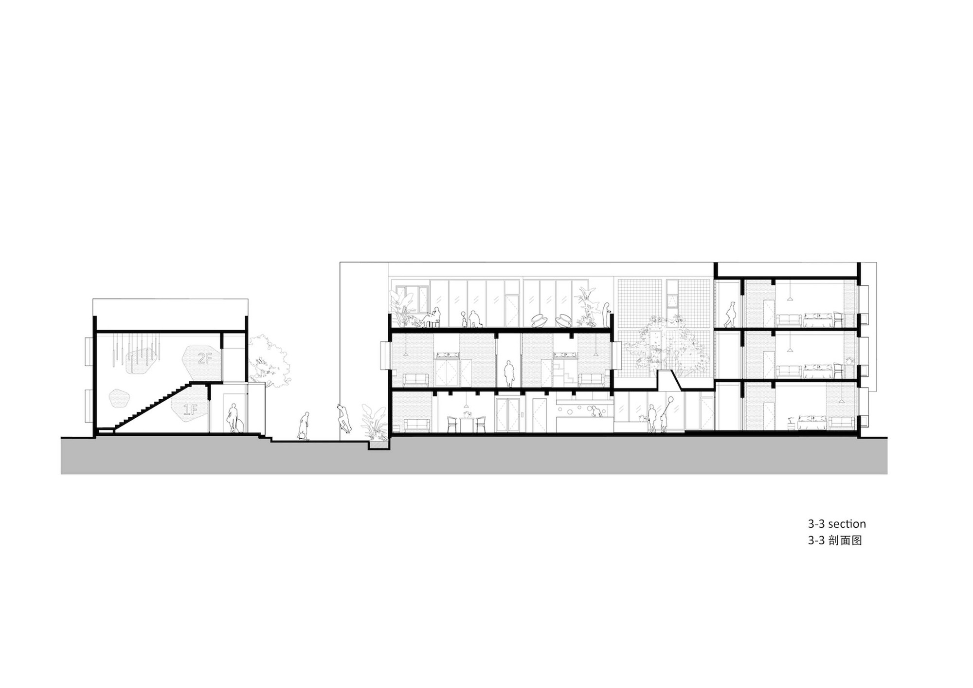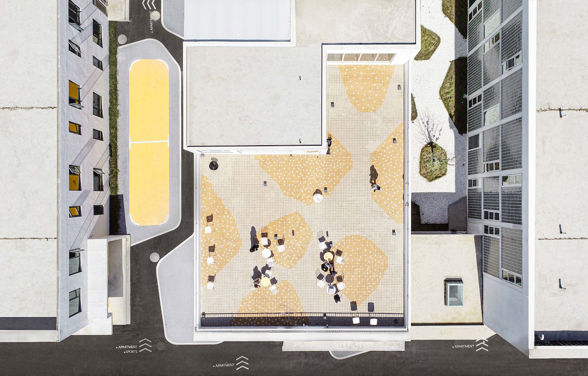 Landscape intervention is mainly on the treatment of the two courtyards and the terrace. The inner courtyard connected to the lobby, it is the first impression when entering the apartment, so we use white gravel and plants to create a quiet and comfort courtyard. The exterior landscape is mainly on hard paving, with different level of gray colors as the background of the building. Both courtyards and terrace are divided in island-shape patterns, attempting to bring a free and flexible landscape to the right-angled building footprint.