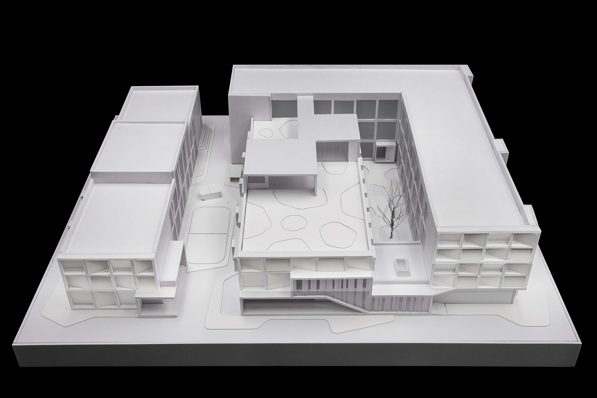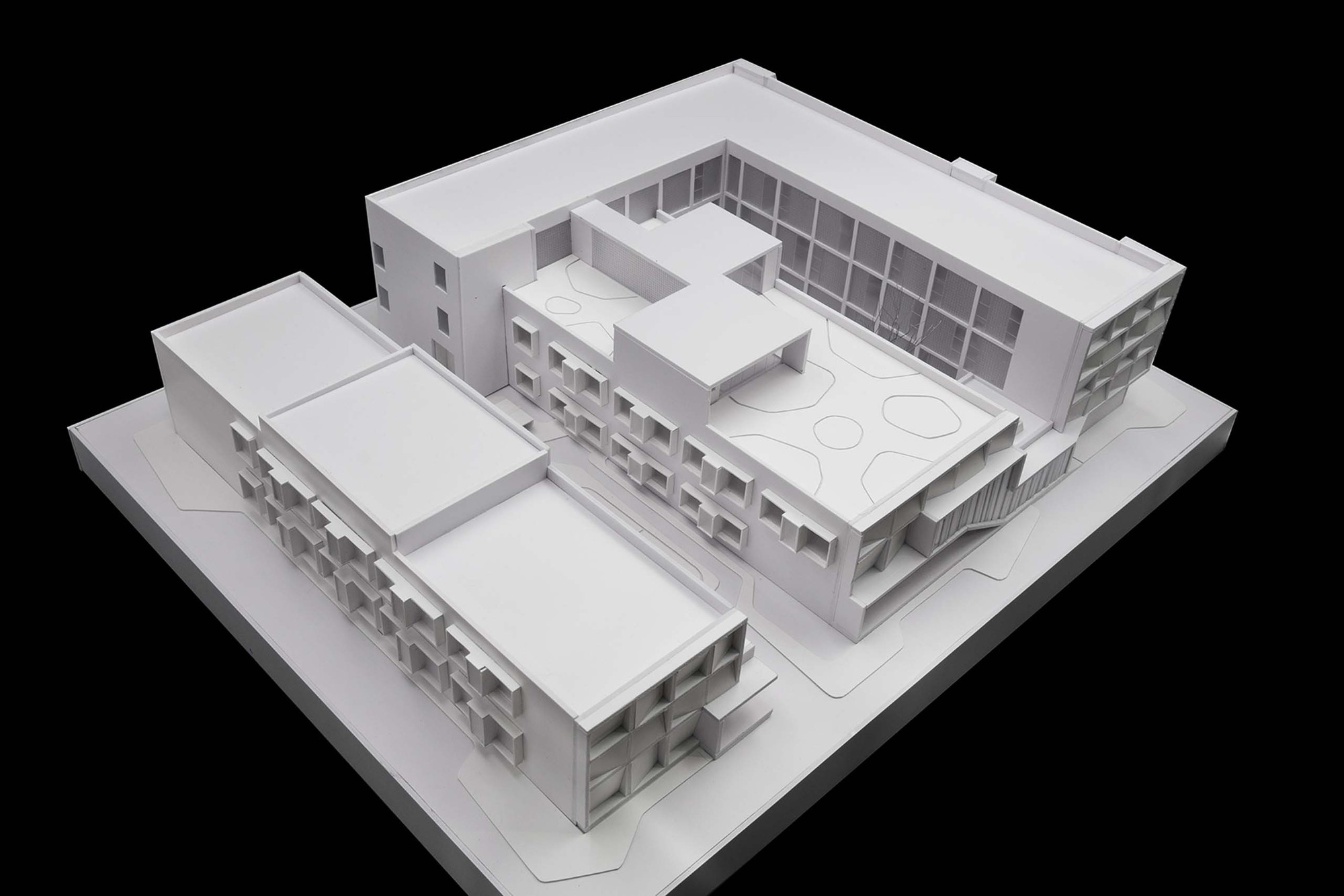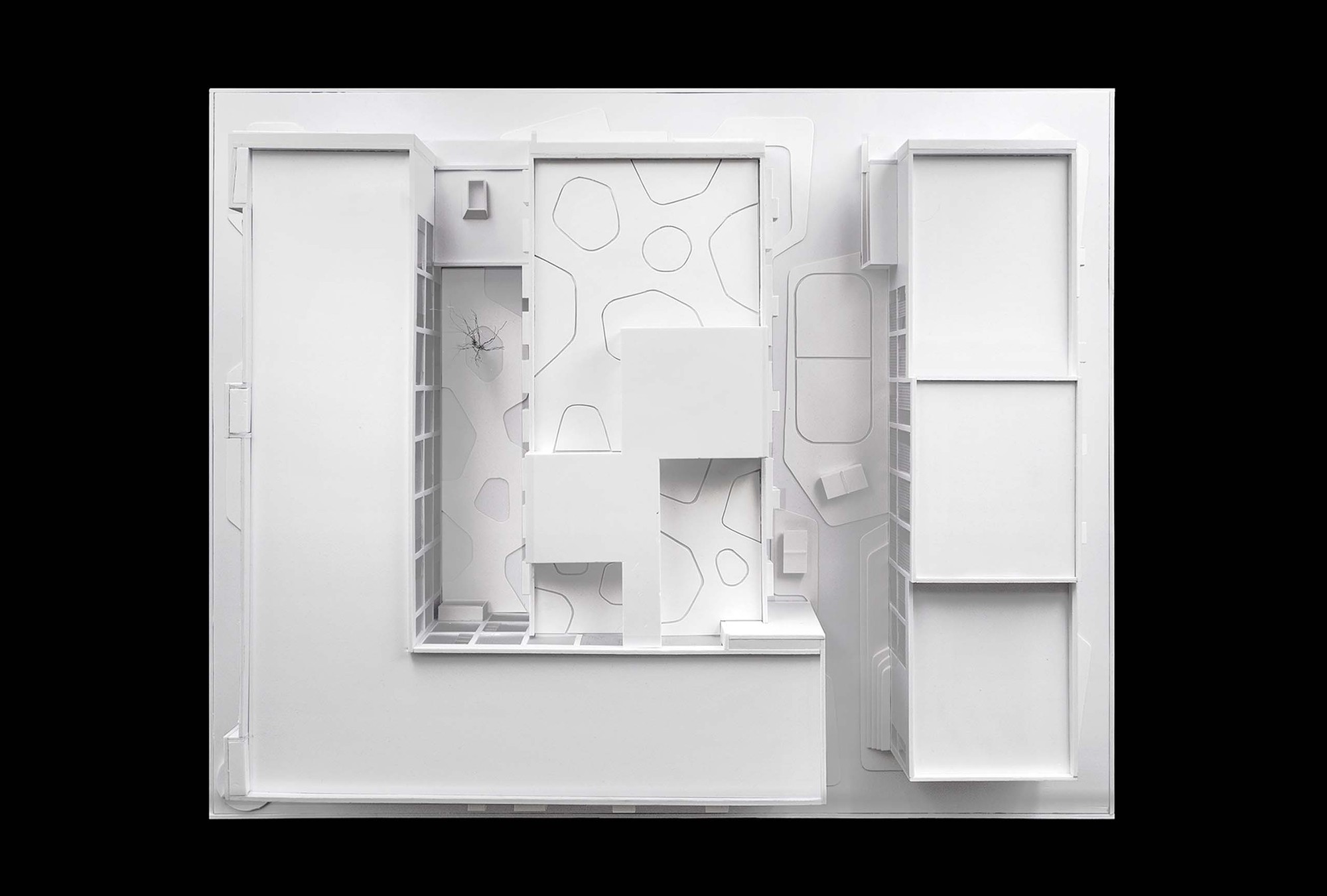 Landscape intervention is mainly on the treatment of the two courtyards and the terrace. The inner courtyard connected to the lobby, it is the first impression when entering the apartment, so we use white gravel and plants to create a quiet and comfort courtyard. The exterior landscape is mainly on hard paving, with different level of gray colors as the background of the building. Both courtyards and terrace are divided in island-shape patterns, attempting to bring a free and flexible landscape to the right-angled building footprint.