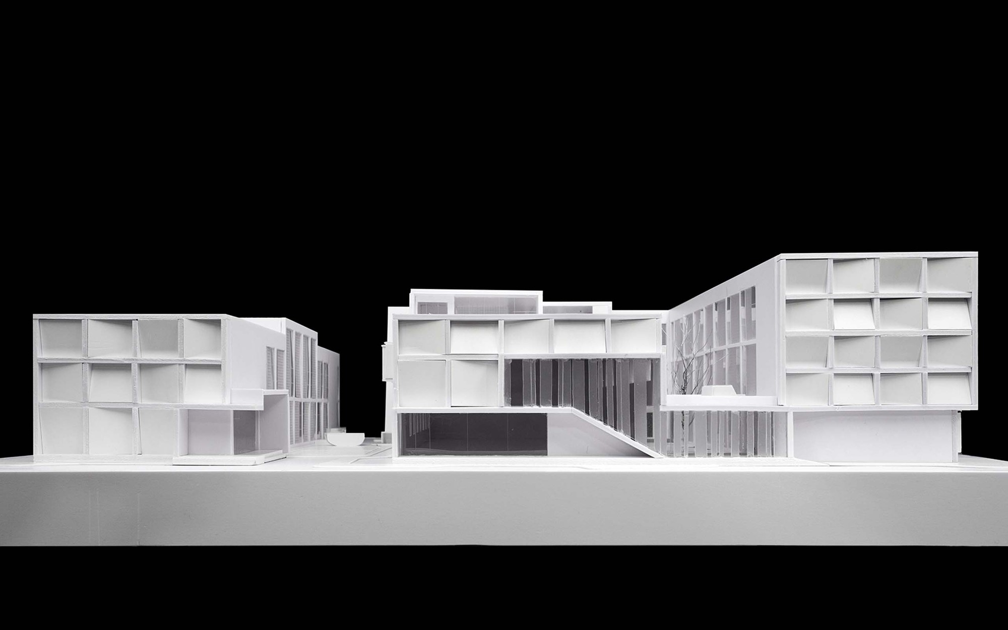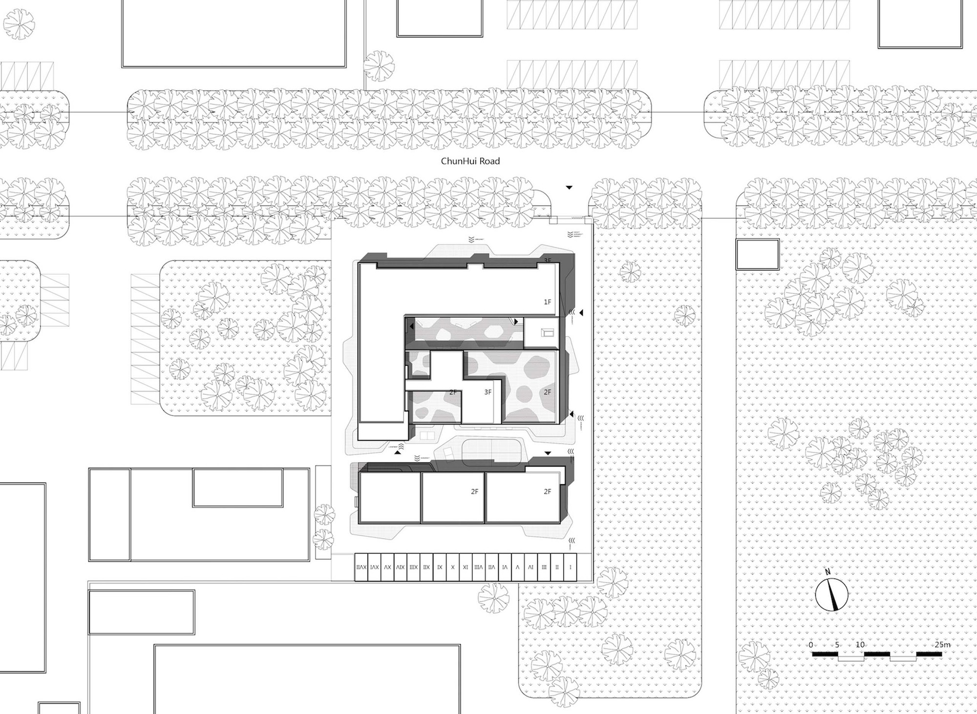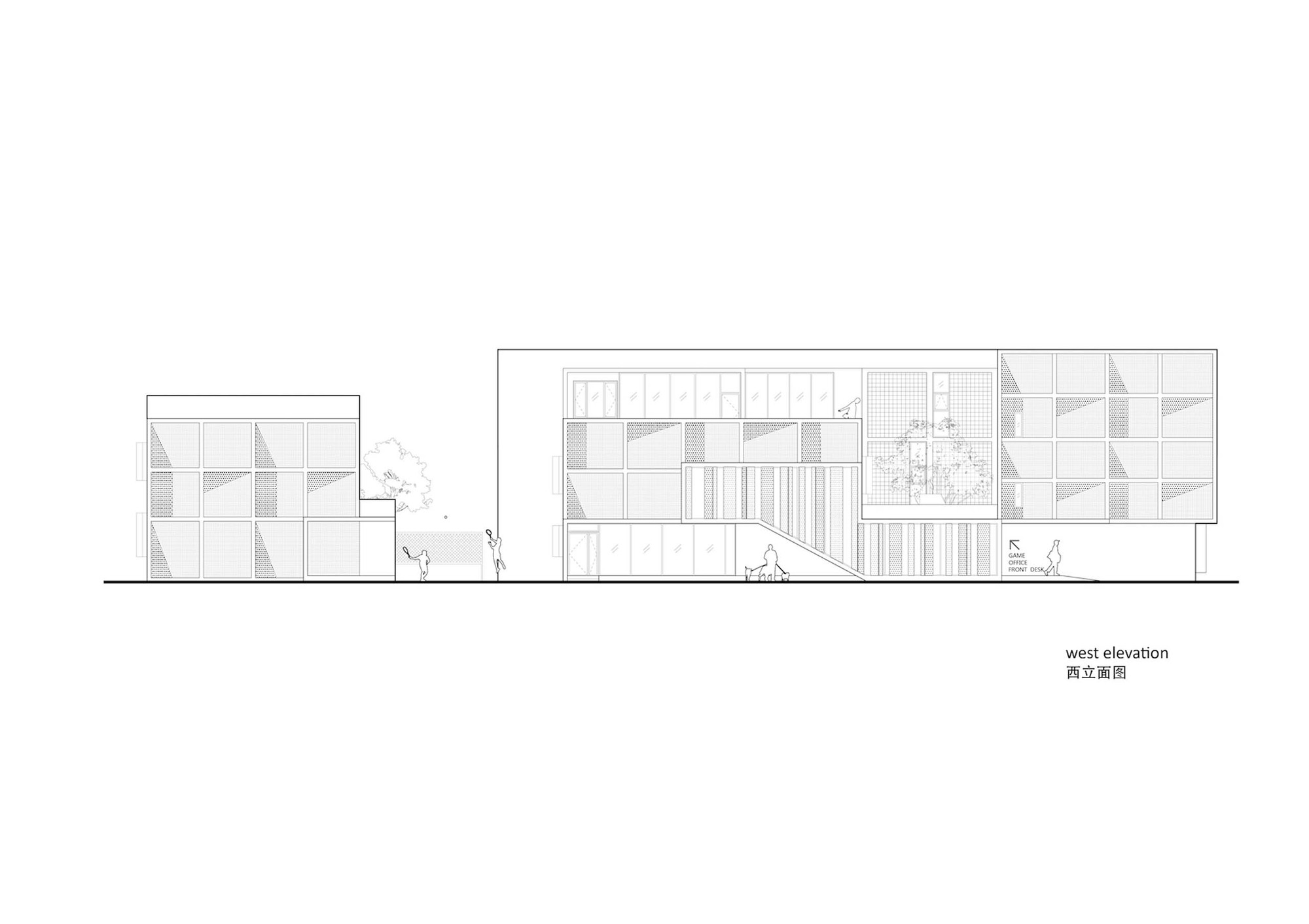 On the north side of the site, two rows of lush sideway trees almost obscures the entire building façade alongside the road, however, the east side of the site is facing an open green space. So we boldly adjust the relationship of the façade and the surrounding environment: we make the east side as the main elevation of the apartment; the ground level lobby is also opened to the east, using as the sharing space for public activities; the east façade of the three buildings are integrated into a formative square language, as the main external character of the youth apartment.